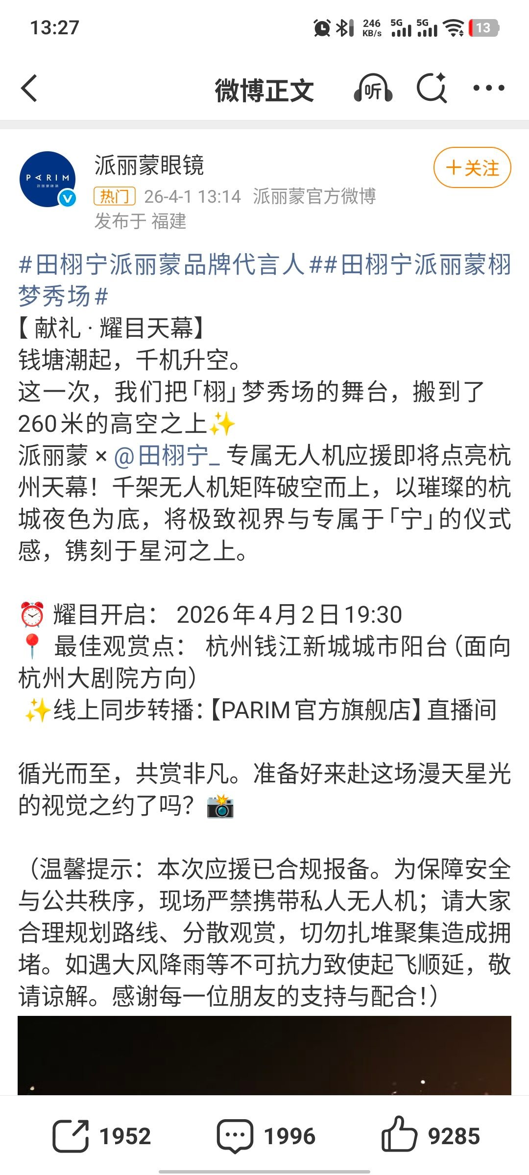 田栩宁田栩宁派丽蒙栩梦秀场派丽蒙给田栩宁无人机应援 派丽蒙这个宠,燥候无人机大秀。啥时候再开直播尼田栩宁派丽蒙品牌代言人