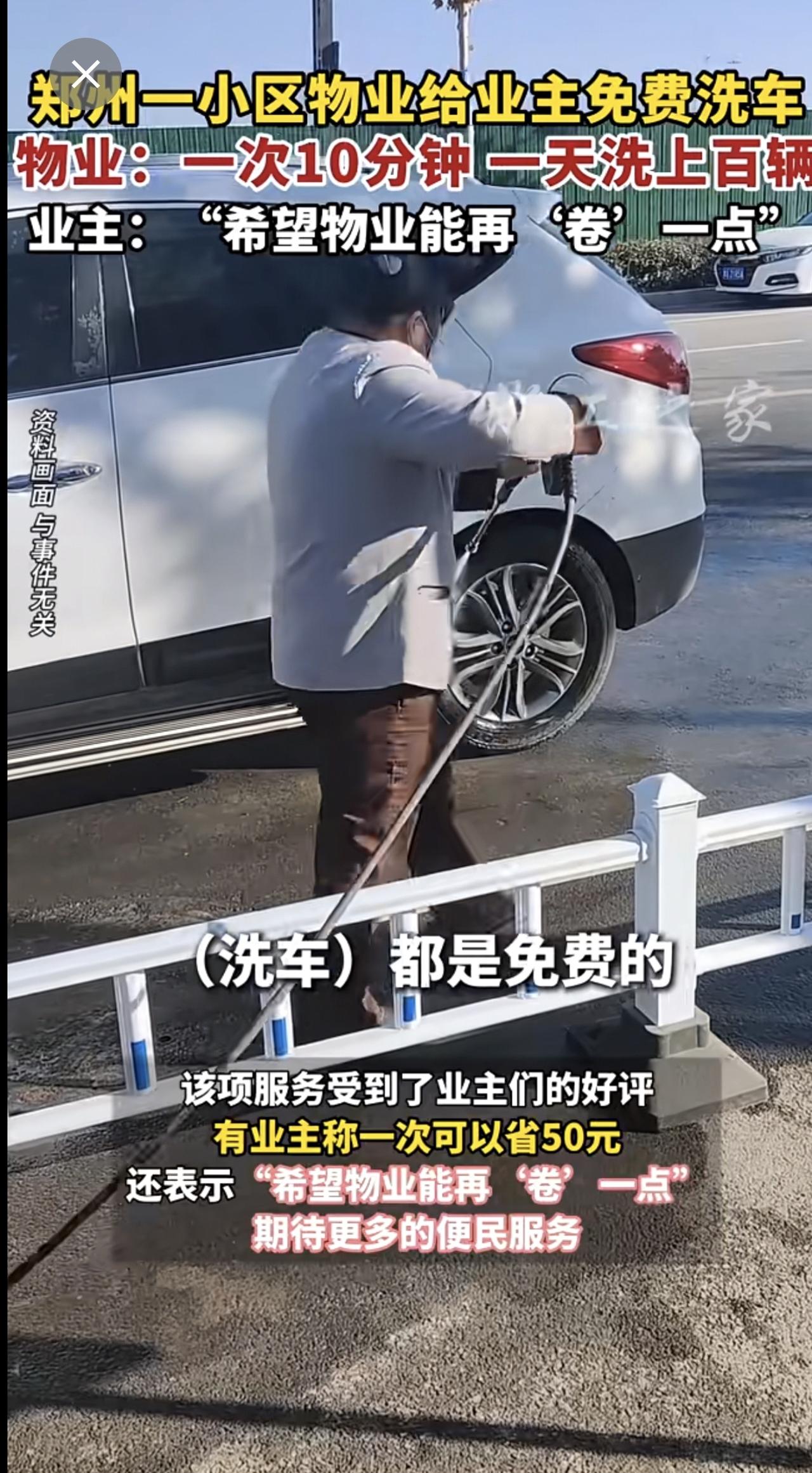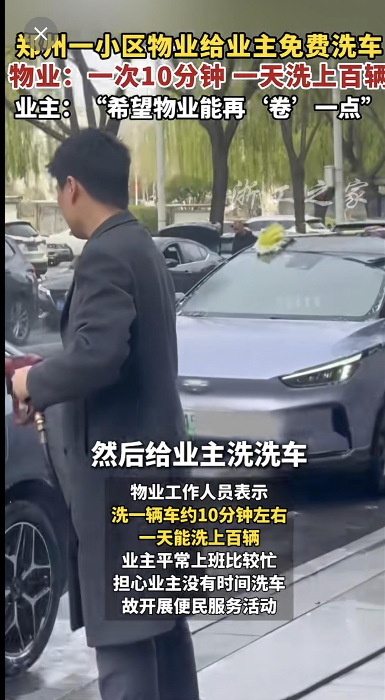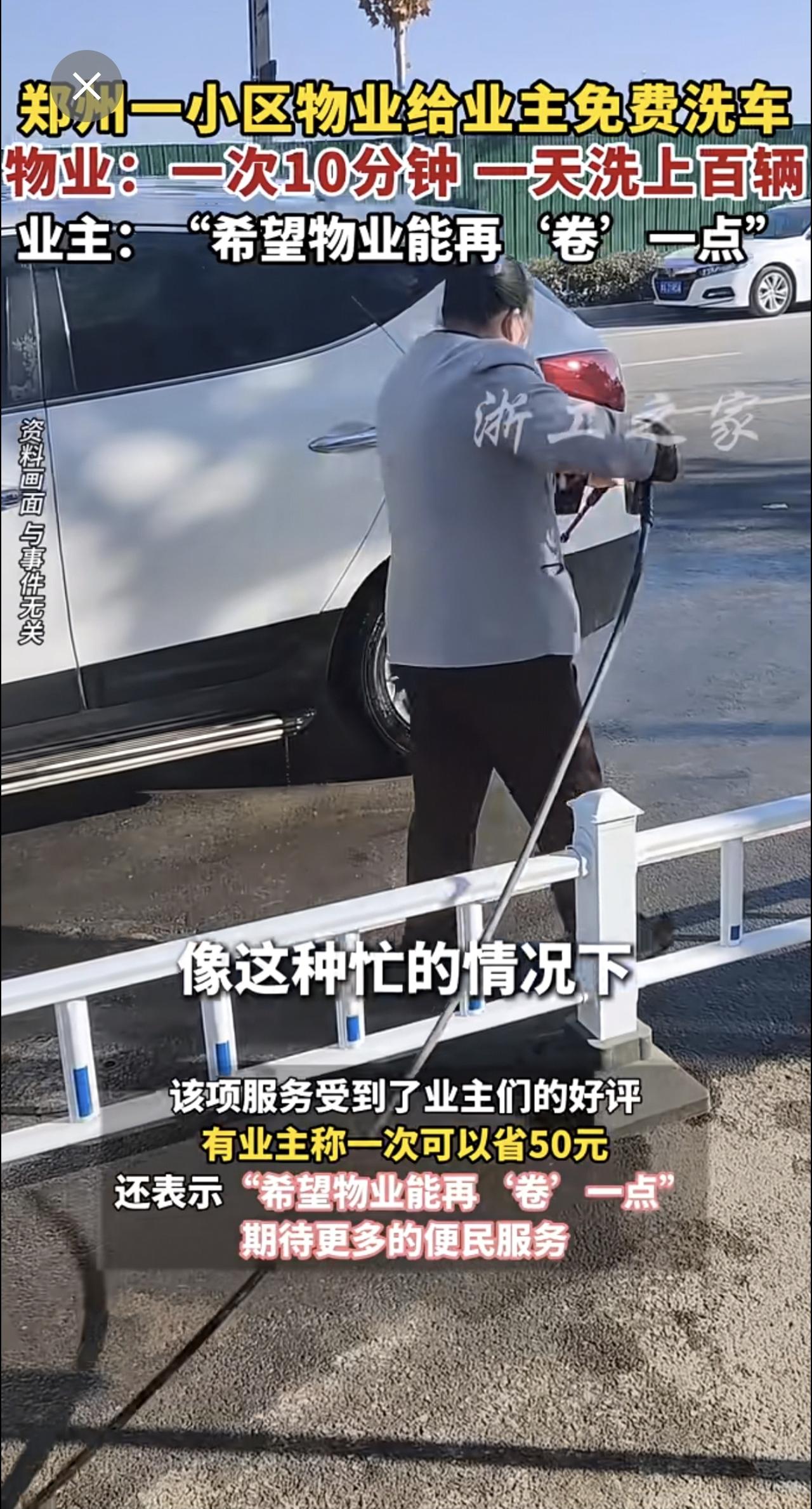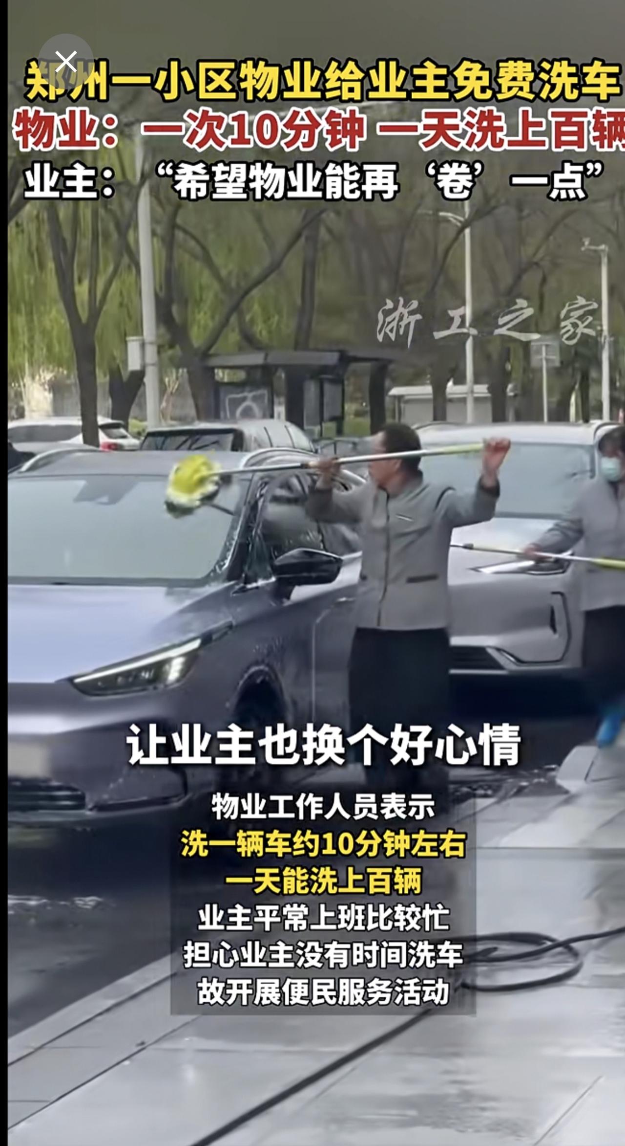 河南郑州一小区物业推出免费洗车服务,有的业主一次省50元:一次十分钟,一天可以洗上百辆 网友:我们物业气我[发怒],你们物业也气我[偷笑](来源:豫视频、大象新闻)