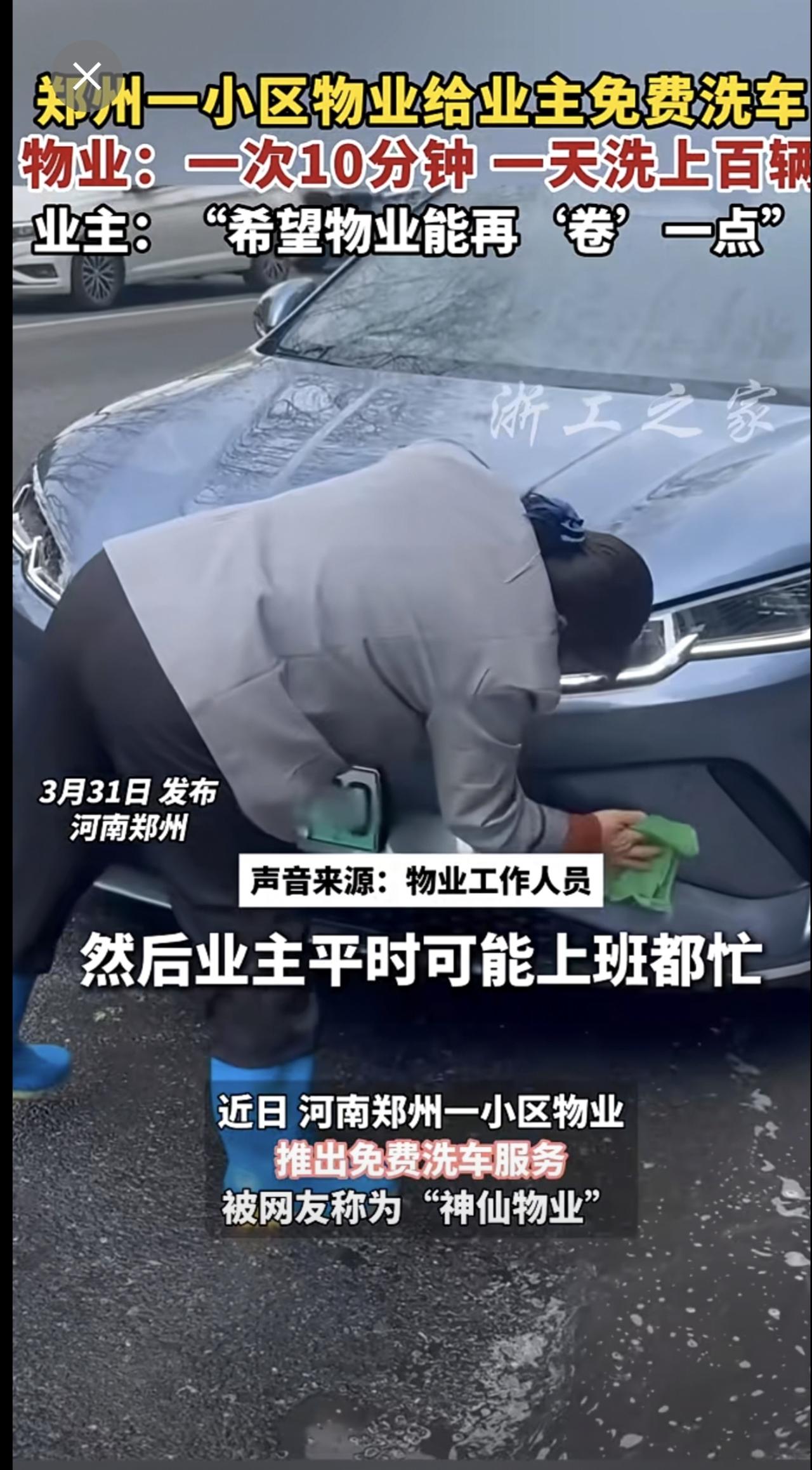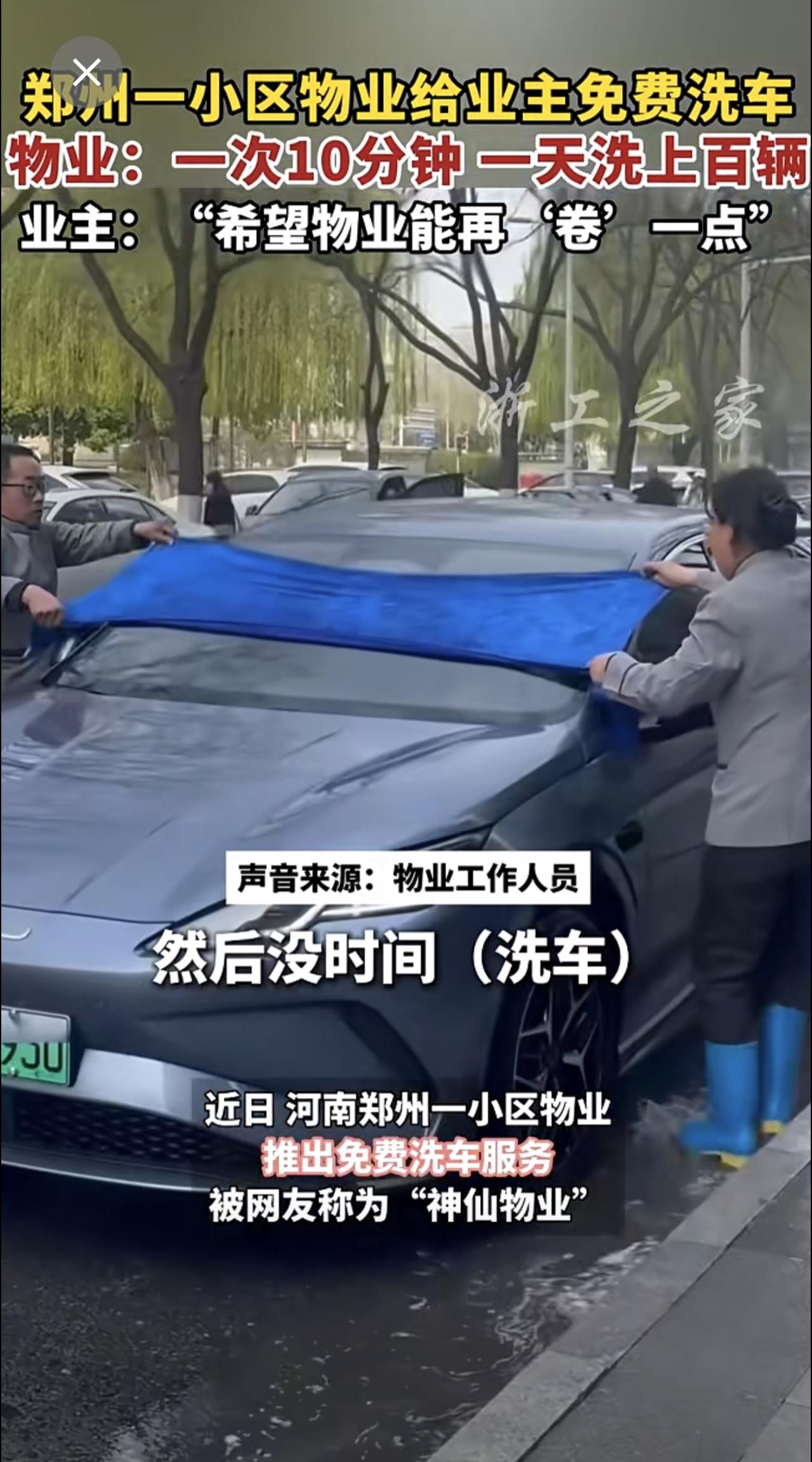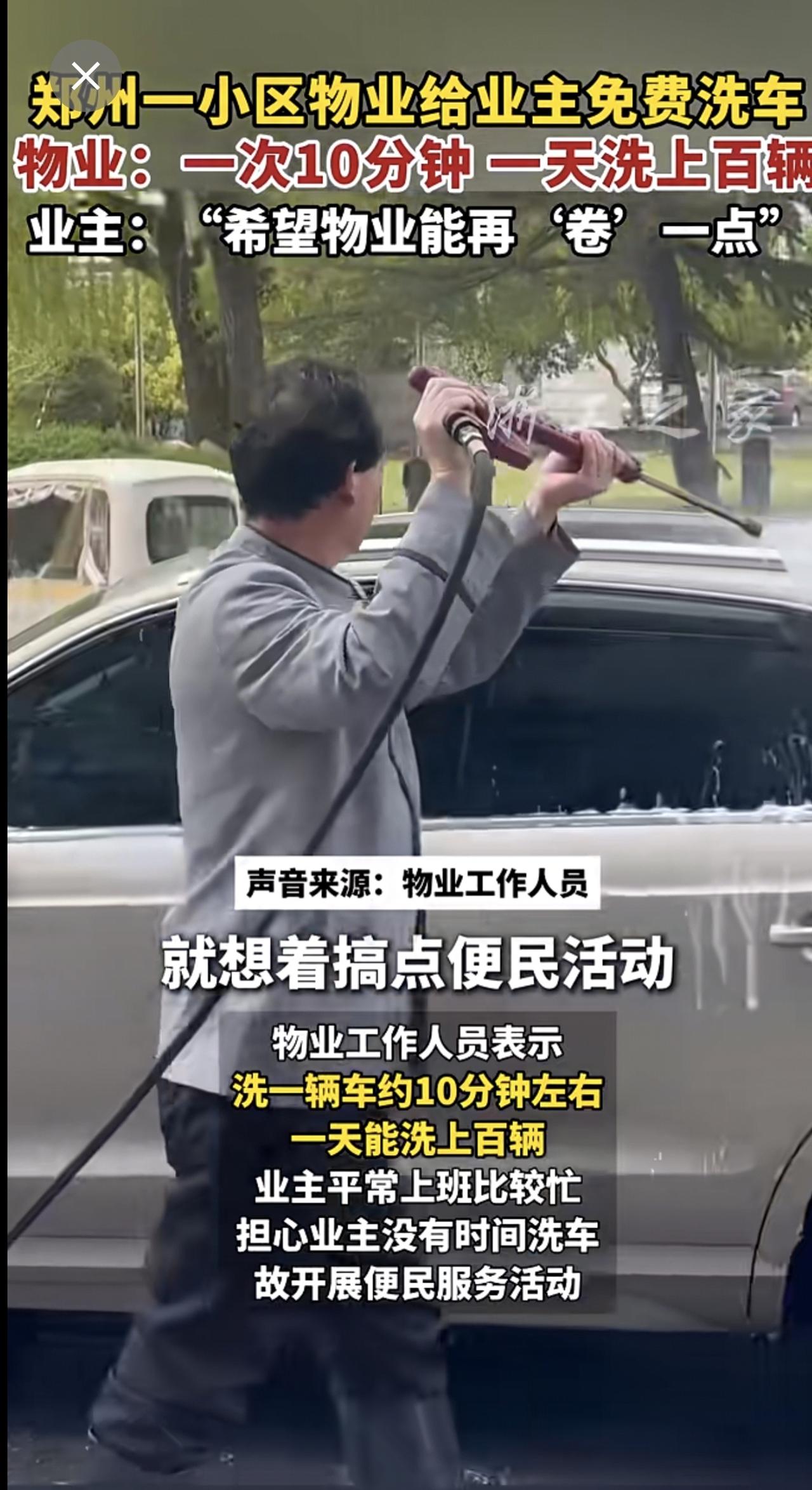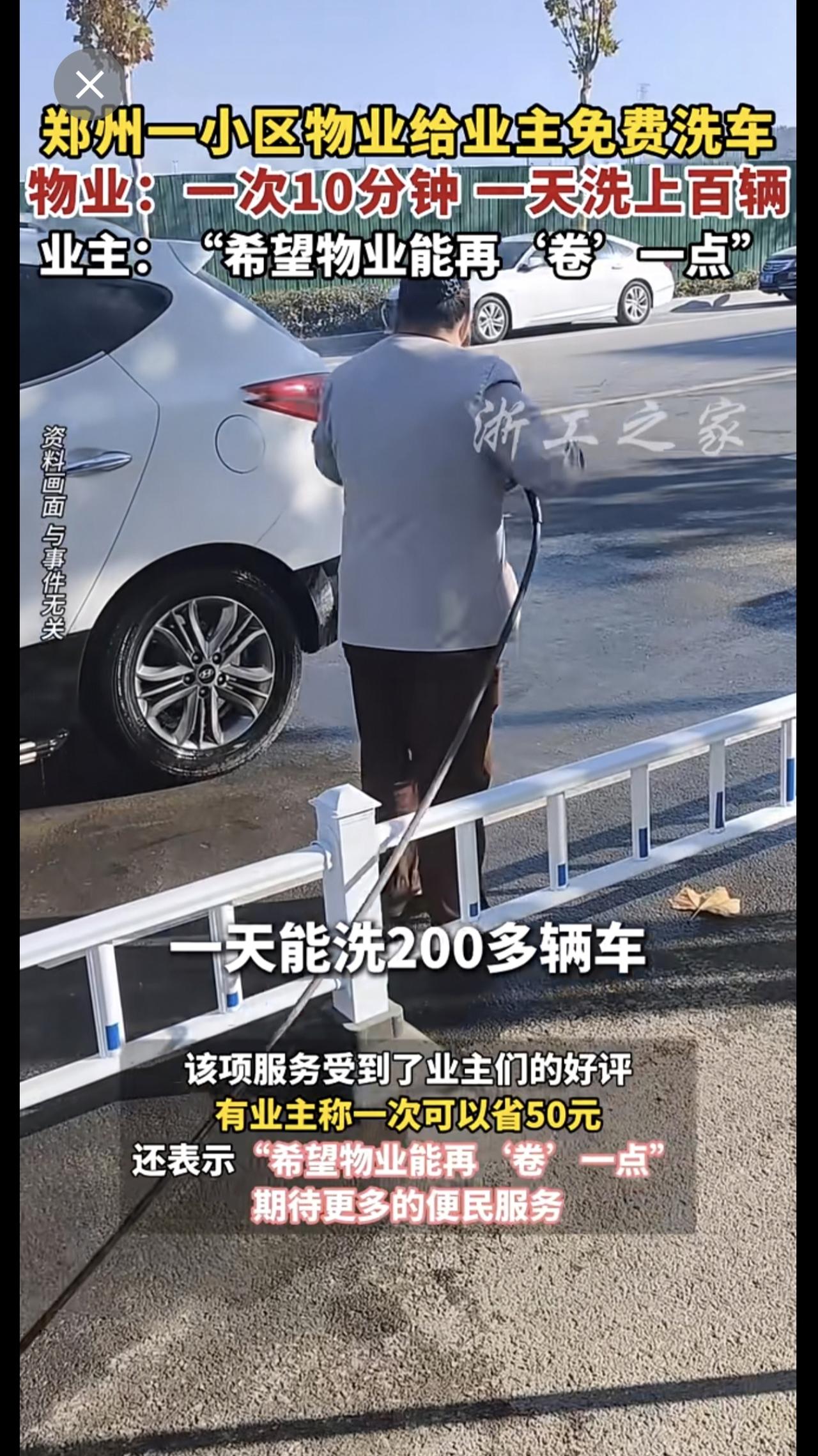 河南郑州一小区物业推出免费洗车服务,有的业主一次省50元:一次十分钟,一天可以洗上百辆 网友:我们物业气我[发怒],你们物业也气我[偷笑](来源:豫视频、大象新闻)