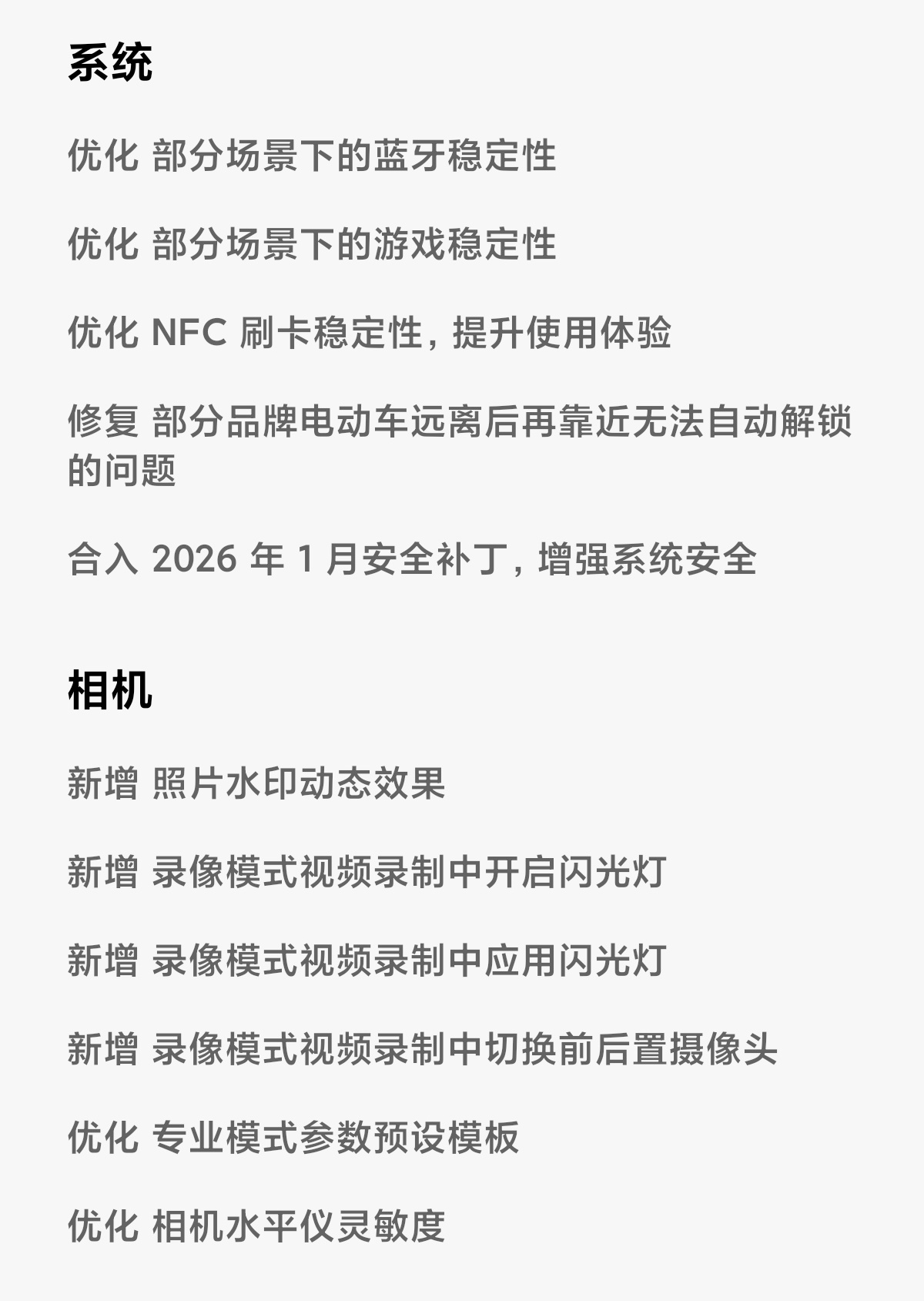 主要包含游戏稳定性和录像闪光灯功能新增