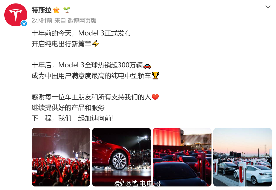 十年前的今天,Model 3正式发布十年后,Model 3不仅全球热销超300万