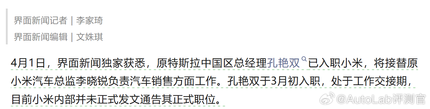 原特斯拉中国区总经理孔艳双去小米了,负责汽车销售方面工作