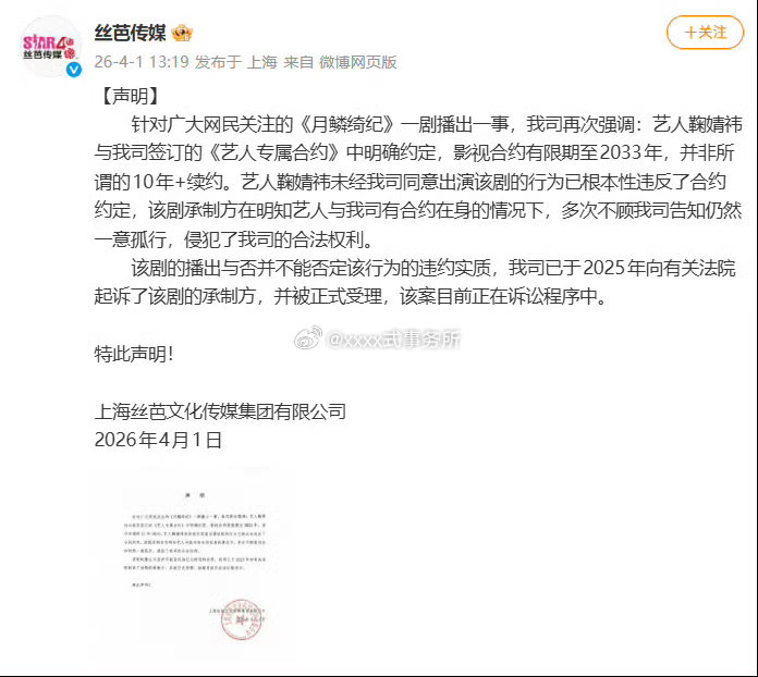 丝芭起诉月鳞绮纪剧方 表示和鞠婧祎影视合约到2023年 未经它同意出演该剧