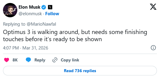马斯克天天画饼,特拉斯人形机器人Optimus Gen 3又又推迟了~马斯克在X