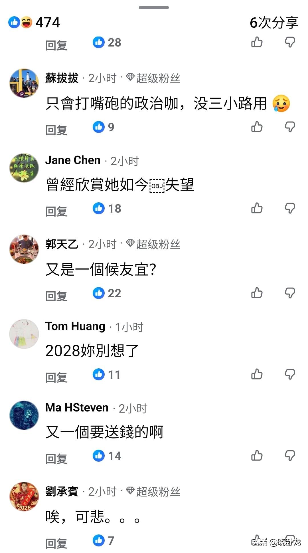在“讨厌卢秀燕”这方面,两岸网友出奇的一致。 我发现一个有趣的现象,现在只要是卢秀燕有什么重要动作或者主张什么议题时,必遭广大网友反感,你如果不信,请看看今日头条(短视频平台也是一样)的作者或者评论区网友对于卢秀燕的评价就知道,而且有意思的是,在头条的中国台湾网友、创作者也几乎没有替卢秀燕说话的。 我关注了卢秀燕的社交账号,我从她之前去美国那段时间发的贴文就看出来岛内网友原来更反感她,卢秀燕窜美期间发了好几篇帖子,结果不仅点赞量相对其他蓝绿政客少很多,就连评论区大多数都是批评她的,有些人直接开骂,而卢秀燕昨天接受绿媒采访谈军购的事情被媒体曝光后,评论区又是一片批评声,我找了很久都没有找到一条支持她的评论,评论区99%都是中国台湾省网友,蓝的绿的都有,看到那些评论我都想笑,原来两岸网友不分阵营,对卢秀燕的讨厌是如此的一致。 一个政客,能做到被两岸网友都讨厌,这人身上得有多少问题?关键她还不自知,还在那故作高深,还端着呢,以为人们都喜欢她,误以为都会支持她代表国民党出来选2028,这就很离谱了。