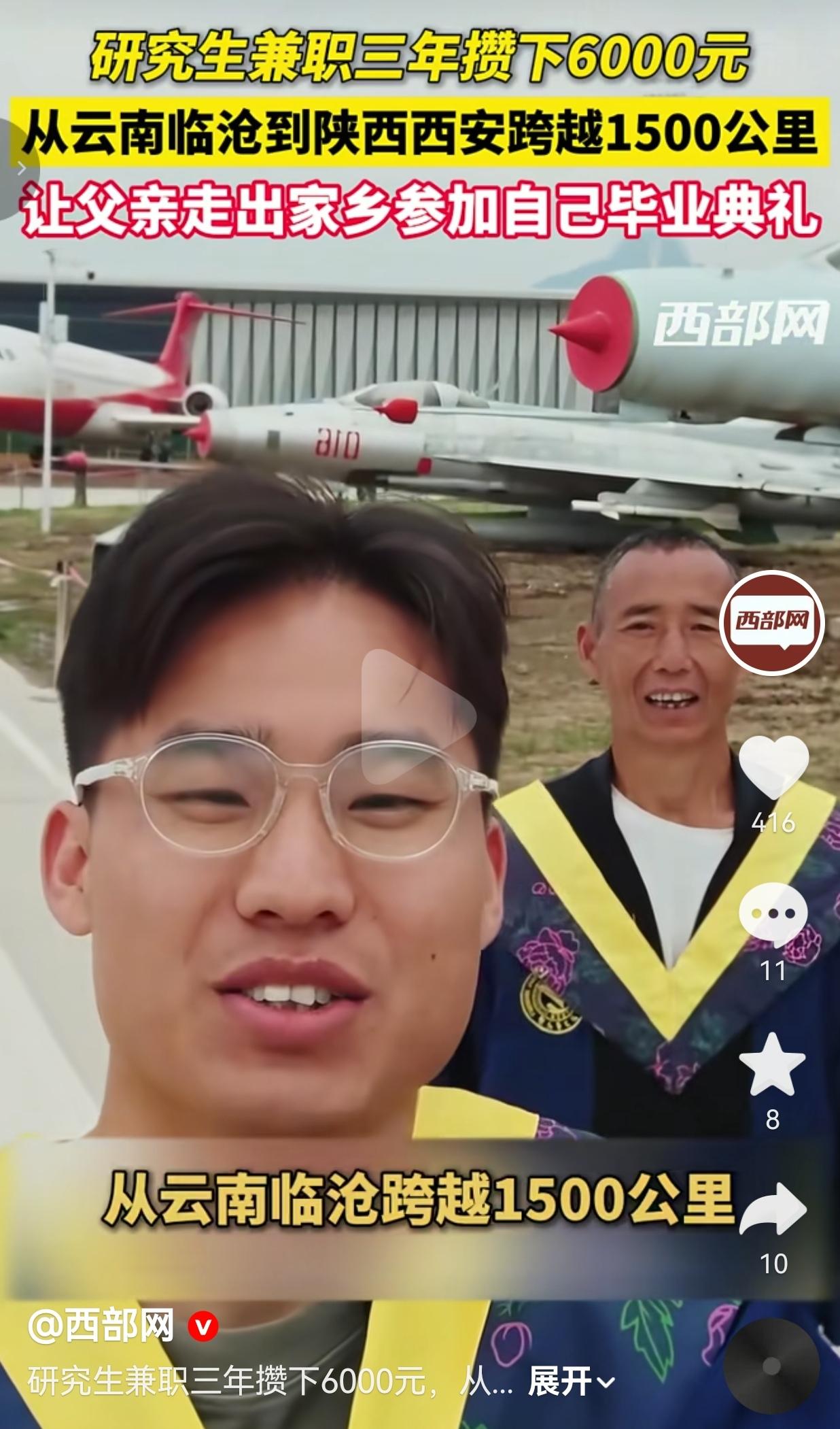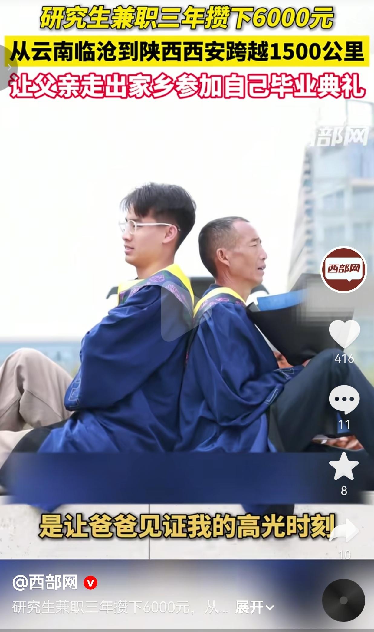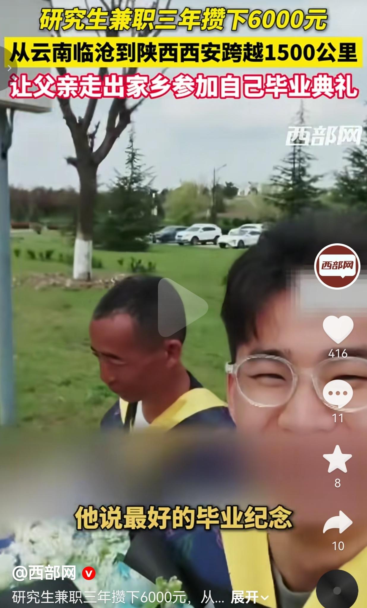 破防了!研究生兼职3年攒6000块,跨越1500公里带父亲参加毕业典礼! 事情发生在陕西西安,罗同学是西北工业大学的一名硕士研究生,来自云南临沧的一个小山村。研究生三年,他没跟家里要过一分钱,全靠自己兼职打工,硬生生攒下了6000块钱。 这笔钱,他一分没花在自己身上,全用来做了一件事:跨越1500公里,把一辈子没出过远门的父亲,从云南老家接到西安,亲眼见证自己的硕士毕业典礼! 视频里,罗同学穿着学士服,笑着问身后的父亲“老爸开心不开心”,老爷子笑得合不拢嘴,眼睛里全是骄傲和欣慰,那笑容里藏着一辈子的辛苦,也藏着对儿子最满的自豪! 罗同学说,自己研究生三年攒了6000块,就是想让父亲走出大山,来看看自己读书的地方,参加自己的毕业典礼。他说,最好的毕业纪念,就是让爸爸亲眼见证自己的高光时刻。 毕业典礼结束后,他还打算带父亲在西安好好逛一天,看看大城市的风景,圆父亲一个走出大山的梦。 这是什么神仙儿子啊!多少人毕业只想着自己吃喝玩乐,多少人把父母的付出当成理所当然,可罗同学用三年的辛苦,给了父亲这辈子最隆重的仪式感! 这事一火,评论区直接炸了,全是破防的网友,句句说到心坎里,有的网友说:我直接破防!我也是农村出来的,我爸一辈子没出过省,我毕业都没敢让他来,怕花钱,这孩子太懂事了! 也有的网友说:这才是真正的孝顺!不是给父母买多少东西,是让他们亲眼看到自己的努力没有白费,让他们骄傲! 还有的网友说:我儿子要是能这样,我这辈子再苦再累都值了!这孩子太争气了! 也有的网友说:从云南临沧到西安,1500公里,是儿子给父亲铺的路,是大山里走出来的光! 说实话,看完这个故事,我心里又酸又暖,眼泪止不住地流。酸的是,多少农村父母一辈子困在大山里,把所有希望都寄托在孩子身上,自己却从来没享过福;暖的是,罗同学没有忘本,他用自己的努力,给了父亲最体面的骄傲! 我们总说“寒门出贵子”,可贵子最难得的,不是考上名校,而是飞黄腾达之后,依然记得拉父母一把,依然记得自己从哪里来!罗同学用三年的兼职,攒下的不是6000块钱,是对父亲最深的爱,是对父母养育之恩最沉甸甸的回报! 多少人读了研、出了国,就嫌父母土、嫌父母没见识,再也不愿意让父母出现在自己的圈子里;可罗同学不一样,他把父亲带到自己的毕业典礼上,让全世界都看到,自己的成功,离不开父亲一辈子的辛苦付出! 这才是真正的感恩,这才是中国人刻在骨子里的孝道!父母给了我们生命,把我们送出大山,我们就该用自己的努力,带父母看看外面的世界,让他们为我们骄傲,让他们这辈子的辛苦,都有一个最圆满的答案! 在这里,我想对所有在外打拼的孩子说:别总说等以后有钱了再孝顺父母,父母等不起!就像罗同学一样,用自己能给的最好的,去回报父母,让他们亲眼看到你的成长,就是对他们最好的安慰! 也想对所有父母说:你们的辛苦,孩子都记在心里,你们的付出,从来都不会白费! 最后,祝福罗同学毕业快乐,前程似锦!也祝福天下所有的父母,都能被孩子温柔以待,都能亲眼见证孩子的高光时刻!