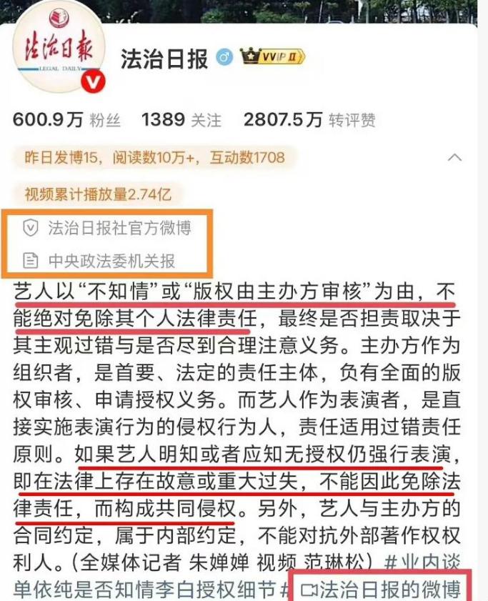 官媒下场,音著协彻查!年少轻狂的单依纯,到了付出代价的时候 事件发生之后,她将责任归于团队经办、自身疏于核查,试图以信任失误弱化主观过错。 商业演出的版权流程有明确行业惯例,曲目选定、授权核验是艺人与团队共同把关的核心环节,尤其在申请被拒的前提下,登台演唱更难用疏忽解释。 这种责任转嫁式表态,反而让公众对其职业严谨性产生质疑,也为后续口碑滑坡埋下伏笔。 多家权威媒体迅速介入,为事件定下理性且严肃的基调。人民日报指出,文艺创作可以包容个性表达,但必须守住法律与版权底线。 法制类媒体明确,“不知情” 不能成为免责挡箭牌,存在重大过失仍需承担法律责任。 官媒集体发声,将事件从艺人私人矛盾拉回行业规则层面,传递出尊重原创、严守法律的明确导向。 中国音乐著作权协会作为专业版权管理机构,同样给出权威结论。协会证实未对该场次发放授权,认定行为构成侵权,并表示将联合多部门全面核查流程细节,必要时向公众公开处理结果。音著协的介入意味着事件不再局限于民事协商,可能进入规范化处置流程,也向行业释放出商业表演必须 “先授权、后使用” 的强烈信号。 回顾双方过往交集,李荣浩曾多次公开肯定单依纯的演唱潜力,以行业前辈身份给予支持与认可。 此前单依纯在综艺中改编《李白》引发审美争议时,李荣浩也保持克制,未过度计较。 此次维权并非针对个人,而是针对无视规则的侵权行为,核心是维护原创音乐人的合法权益与行业秩序,并非追求经济赔偿。 对于青年艺人而言,舞台表现力固然重要,但尊重版权、恪守规则才是长期发展的根基,试图用情绪表达与责任转嫁化解合规问题,只会适得其反。 这场风波也给整个音乐行业敲响警钟。 商业演出版权管理早已成熟规范,授权申请、流程核验、文件确认均有清晰路径,侵权本可完全避免。 事件暴露出部分团队流程管理松散、艺人合规意识薄弱的问题,也说明行业仍需强化版权普法与责任落实。 单依纯的当前困境,本质是规则意识缺失带来的必然结果。商业舞台上的每一次表演,都应建立在合法合规的基础上,道歉与补救只能降低影响,无法抹去侵权事实。 对于青年歌手而言,唱功与热度是外在光环,敬畏法律、尊重原创才是立身之本。 这场风波也提醒所有从业者,版权红线不容触碰,行业秩序需要共同守护,唯有守住底线,才能走得更稳更远。