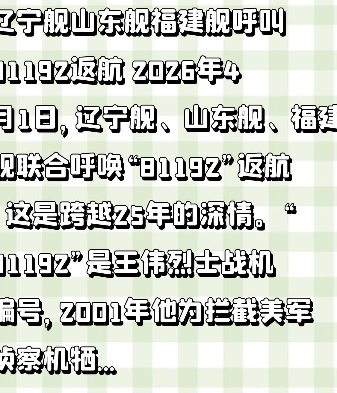 辽宁舰山东舰福建舰呼叫81192返航 2026年4月1日,辽宁舰、山东舰、福建舰联合呼唤“81192”返航,这是跨越25年的深情。“81192”是王伟烈士战机编号,2001年他为拦截美军侦察机牺牲,年仅33岁,生前他最大的愿望是从航母起飞。 如今中国进入“三航母时代”,辽宁舰2012年服役,终结无航母历史;山东舰2019年服役,是首艘国产航母;福建舰2025年服役,是全球首艘常规动力电磁弹射航母。山河已无恙,三航母呼唤“甲板已清空,请立即返航”。英雄未竟的梦想已成真,这盛世,如你所愿!