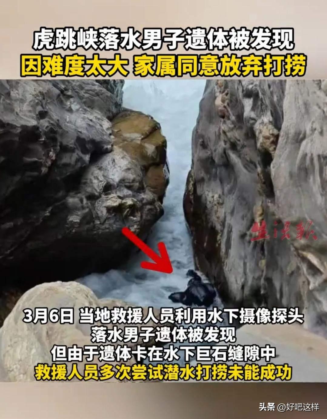 为了洗一下自己的杯子,未婚男子命丧虎跳峡。未婚妻哭成泪人。最后叫来打捞的人们,由于其卡在激流的水下面,又是被石头卡住,家属无奈最终选择放弃了打捞。对于我来说,看见那么汹涌澎湃的水,肯定是不敢的,因为觉得自己晕水,特别是流速很快又大的水。你们大家怕这种场景吗?