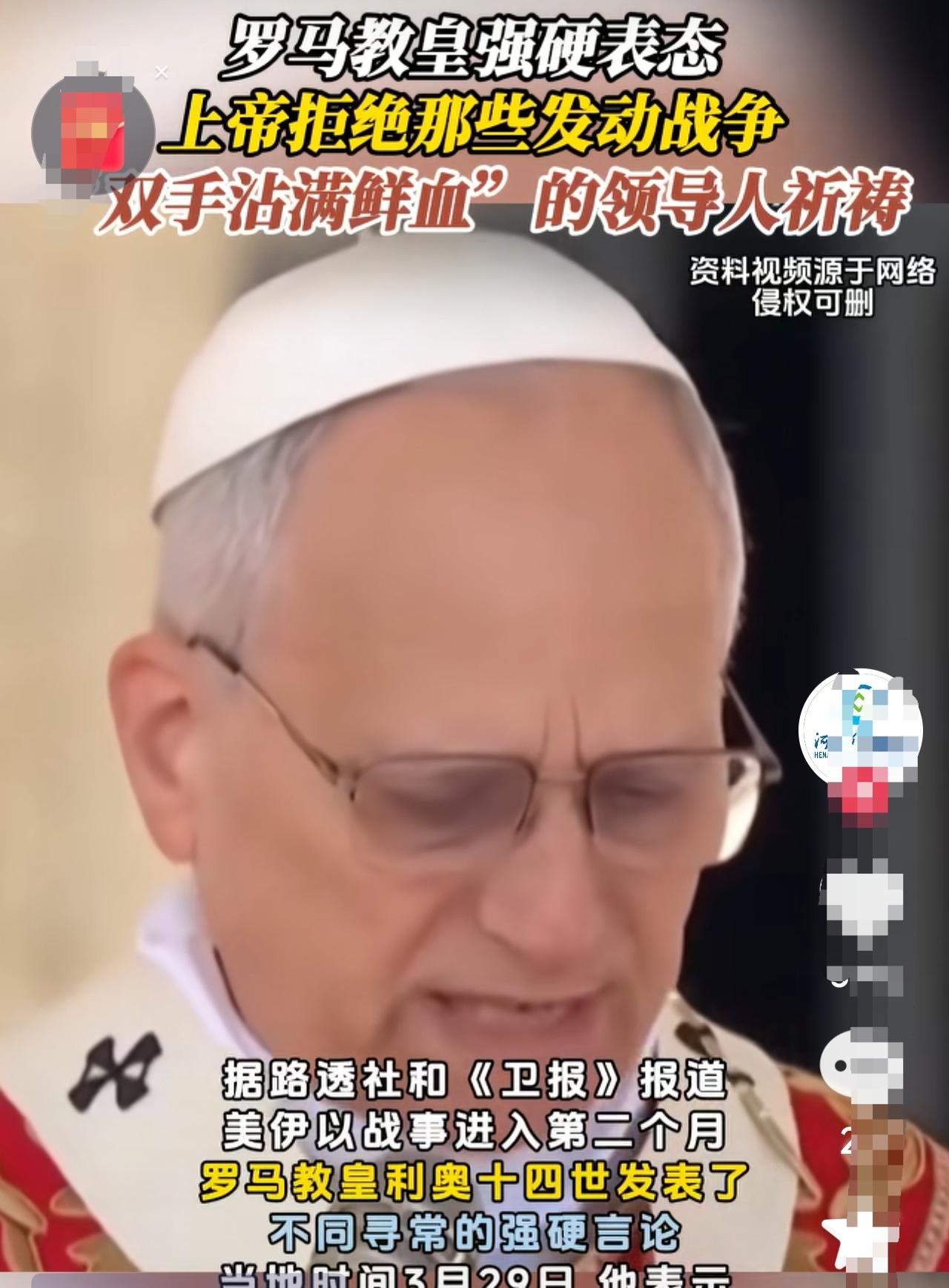 西方人信奉最大的神主代言人罗马教皇强硬表态,上帝不允许发动战争,双手沾满鲜血的领导人祈祷。 这很讽刺,3月5号,特朗普在白宫搞了一堆人在那为战场和战场上的士兵们祈祷。 要知道作为宗教信仰来说,西方人一直信奉的就是基督教天主教,在一定程度上疯狂的排斥伊斯兰教和东正教。罗马教皇作为神主的代言人,在人世间也是一直受到信仰民众的尊崇。他历来也都是一个中立客观的立场,发表一些不疼不痒的言论。 但这一次面对中东战火燃烧出来的恶狱般的景象,估计他也感觉到上帝发怒了,于是他也就发火🔥了,直接不让发动战争的双手沾满鲜血的领导人祈祷,可以说是直接斩断了假惺惺信奉、赤裸裸杀戮的这双恶棍之手。