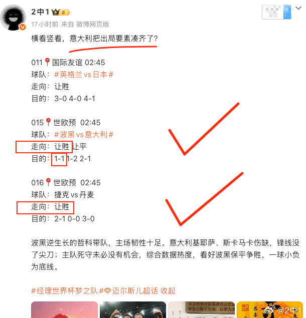 波黑和捷克,老刘赛前就吃得透。波黑主场拖住意大利,不是运气,主场硬度和哲科那口气都在。79分钟扳平拖进点球,意大利直接泄了。捷克很好理解,主场十连不败不是摆设,丹麦客场虫的毛病一直在,点球过关也在预期里。