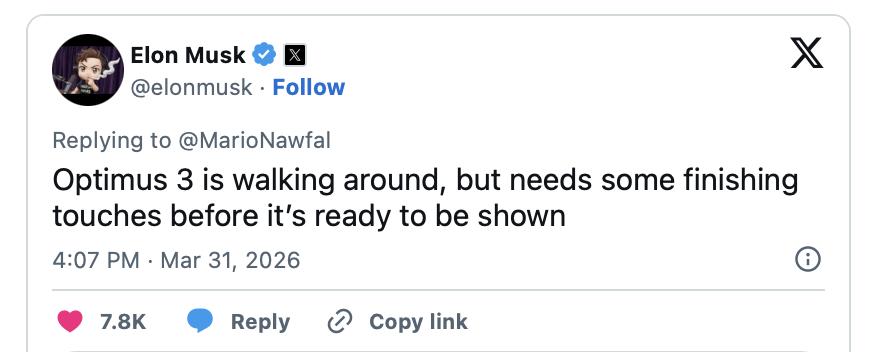 马斯克机器人又鸽了 3月31日,马斯克在X上发文称,Optimus 3已具备移动能力,但在正式向公众展示前还需要进行一些收尾工作。他选择在第一季度最后一天发布这个消息,让不少粉丝失望,因为特斯拉此前曾表示将在第一季度发布第三代Optimus。 特斯拉原计划在2026年第一季度展示第三代Optimus机器人的量产版本,并将其定位为迈向工厂部署和最终商业化的重要一步。马斯克曾表示,该机器人拥有先进的功能,包括高度灵巧、具有高自由度的双手,并由特斯拉的人工智能系统驱动,能够执行复杂的任务。 但是目前来看,机器人面向公众的时间又要往后延期了……倒是符合马斯克一贯风格。【来自懂车帝车友圈】