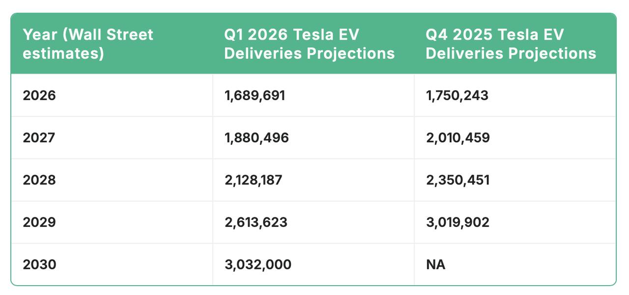 特斯拉周四将公布Q1交付数据,在此之前官网上公布了华尔街分析师的销量预测,汇总了摩根士丹利、巴克莱、汇丰在内的23家金融公司的预测。 这些投资机构预测Model 3和Model Y的交付量将出现小幅同比增长,合计交付量为351,179辆,比去年同期官方公布的第一季度数据增长约8%。分析师还预测Model S、Model X和Cybertruck的交付量也将增长8%,合计交付量为13,946辆。 不过分析师预计,未来几年特斯拉电动汽车的销量增长将较为缓慢。事实上,与特斯拉第四季度公布的分析师普遍预期相比,投资机构已下调了2026年至2029年每年的交付量预期。上个季度,分析师普遍预期特斯拉2026年全球交付量为175万辆。如今这一数字被下调至约168万辆,减少了超过6万辆。 当然,华尔街通常会频繁地调整交付量预测,而这些预测会受到一系列变量的影响,包括地缘政治紧张局势、供应链限制、联邦政策以及特斯拉自身的产品路线图。 目前,特斯拉专注于扩大其Optimus人形机器人的生产规模,并利用即将推出的Cybercab构建其自动驾驶出租车网络。【来自懂车帝车友圈】