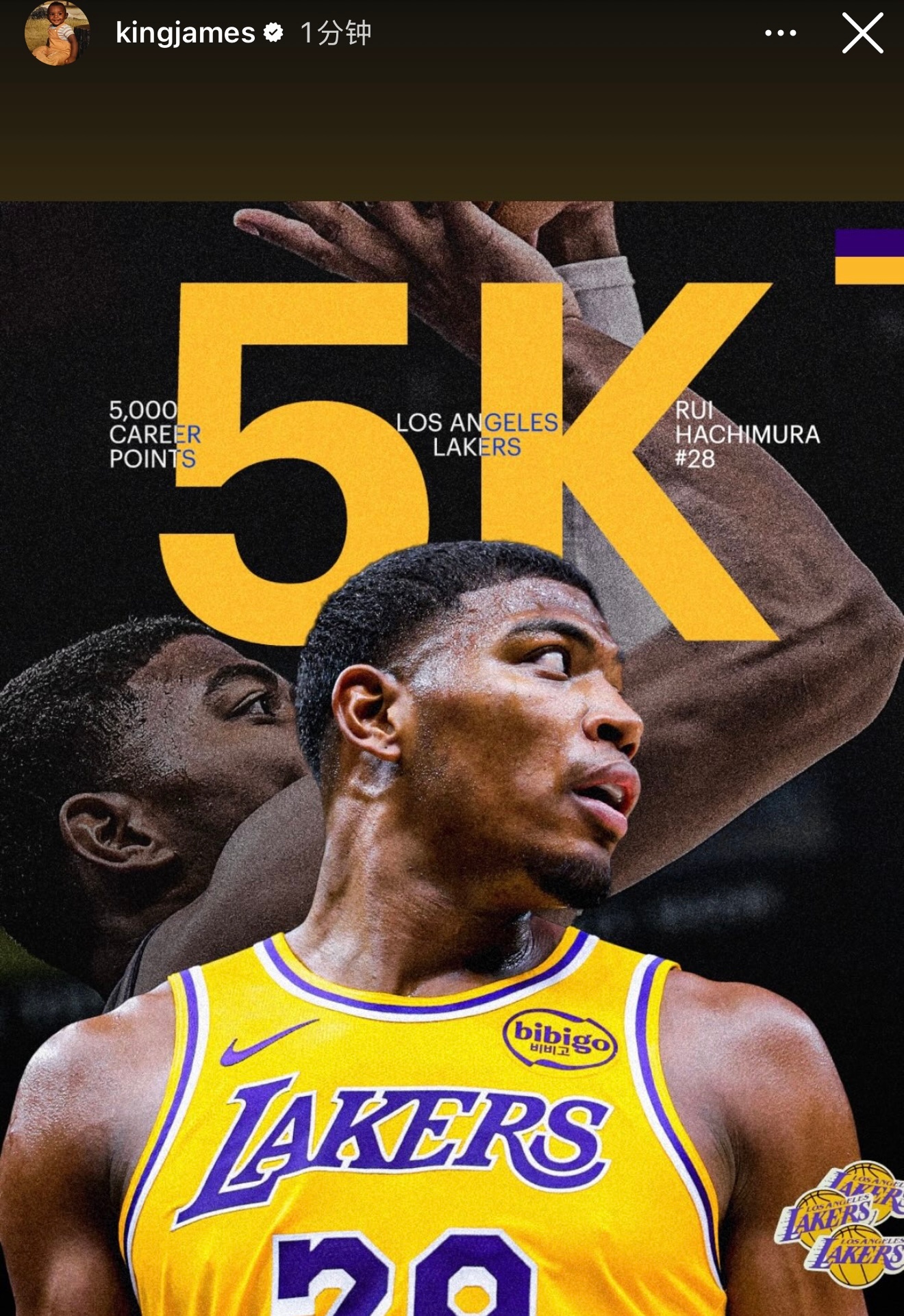 詹姆斯更新社媒,表达了祝贺:东契奇生涯15000分八村塁生涯5000分雷迪克生涯