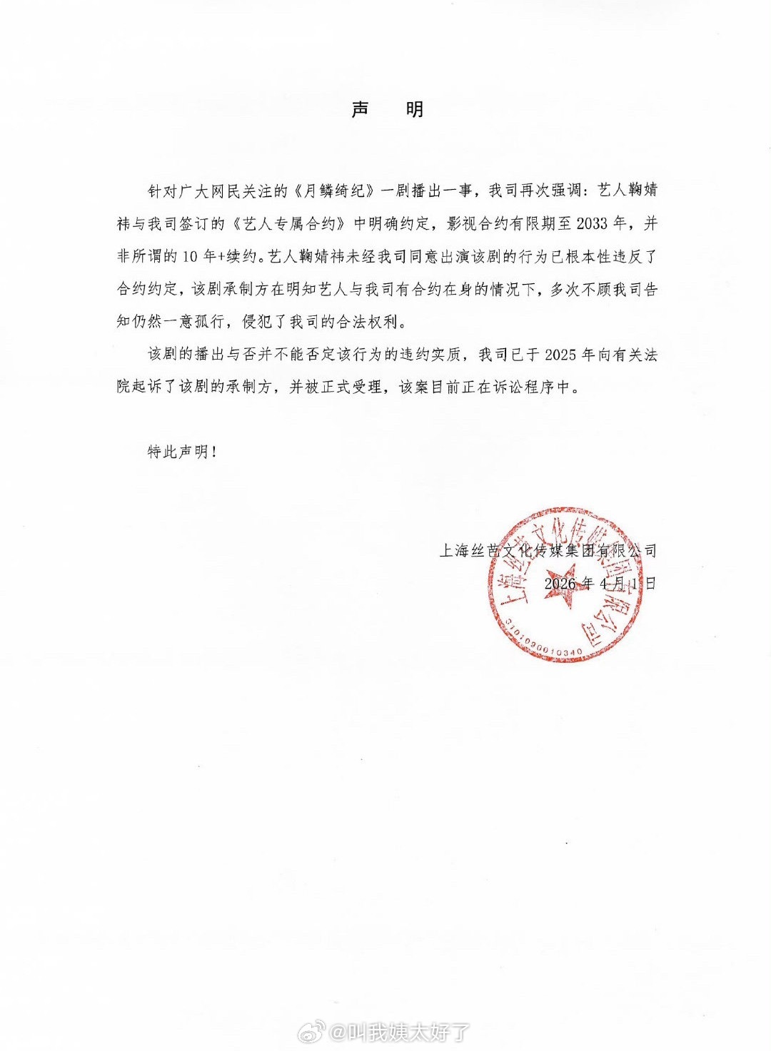 丝芭这次直接告了《月鳞绮纪》的制作方,说鞠婧祎的影视合约是到2033年。