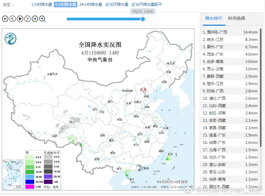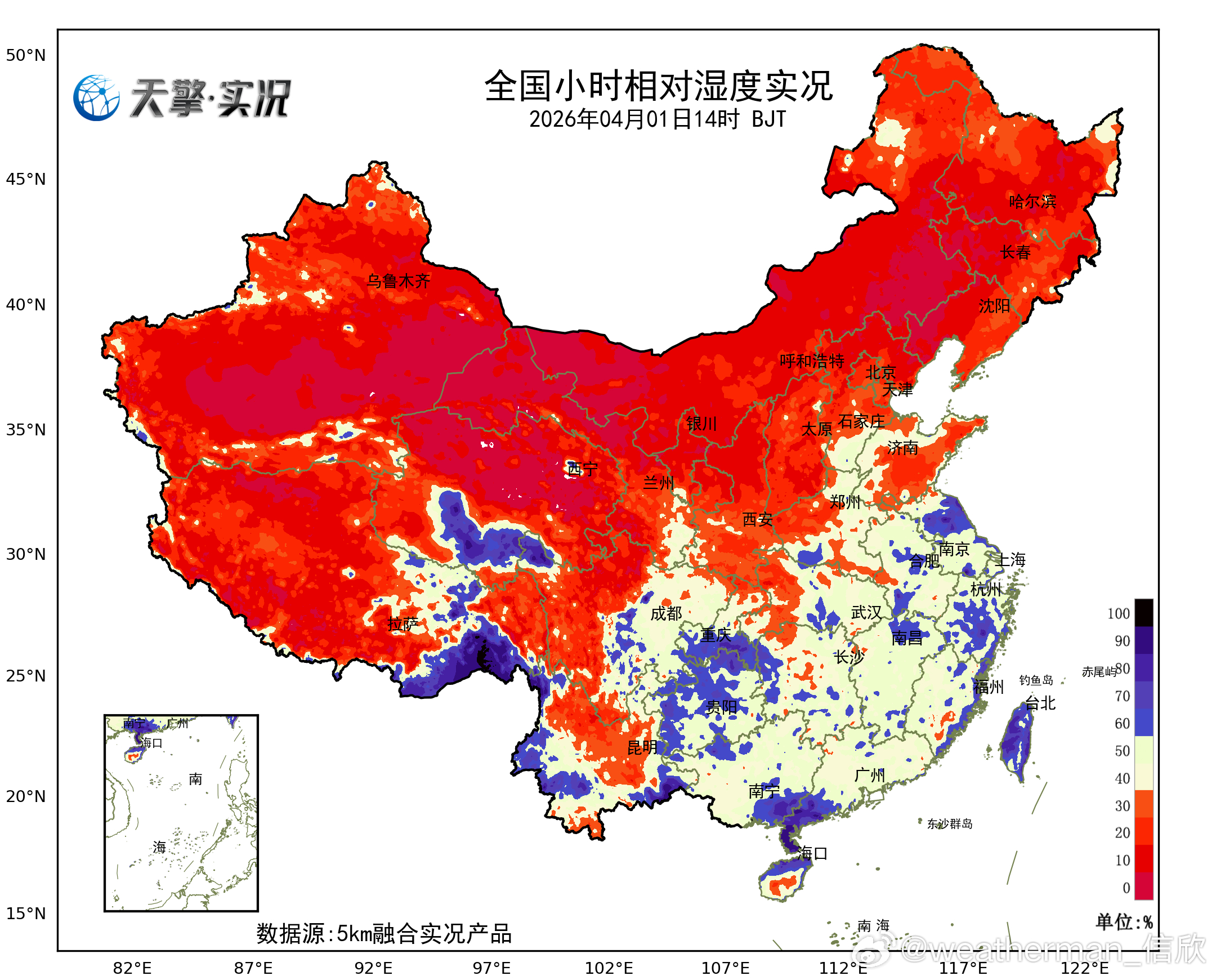 【降水和干燥】今天08-14时,我国降水稀少,好久没有看到过,地图上大片空白无降水。下午北方多地相对湿度不足30%,部分地区低于10%,青海德令哈3%,为14时全国相对湿度最低站点。从卫星云图看,从缅甸到我国西南一带有降水云系在东移,今天晚间到明天,我国南方降雨又会自西向东发展增多。