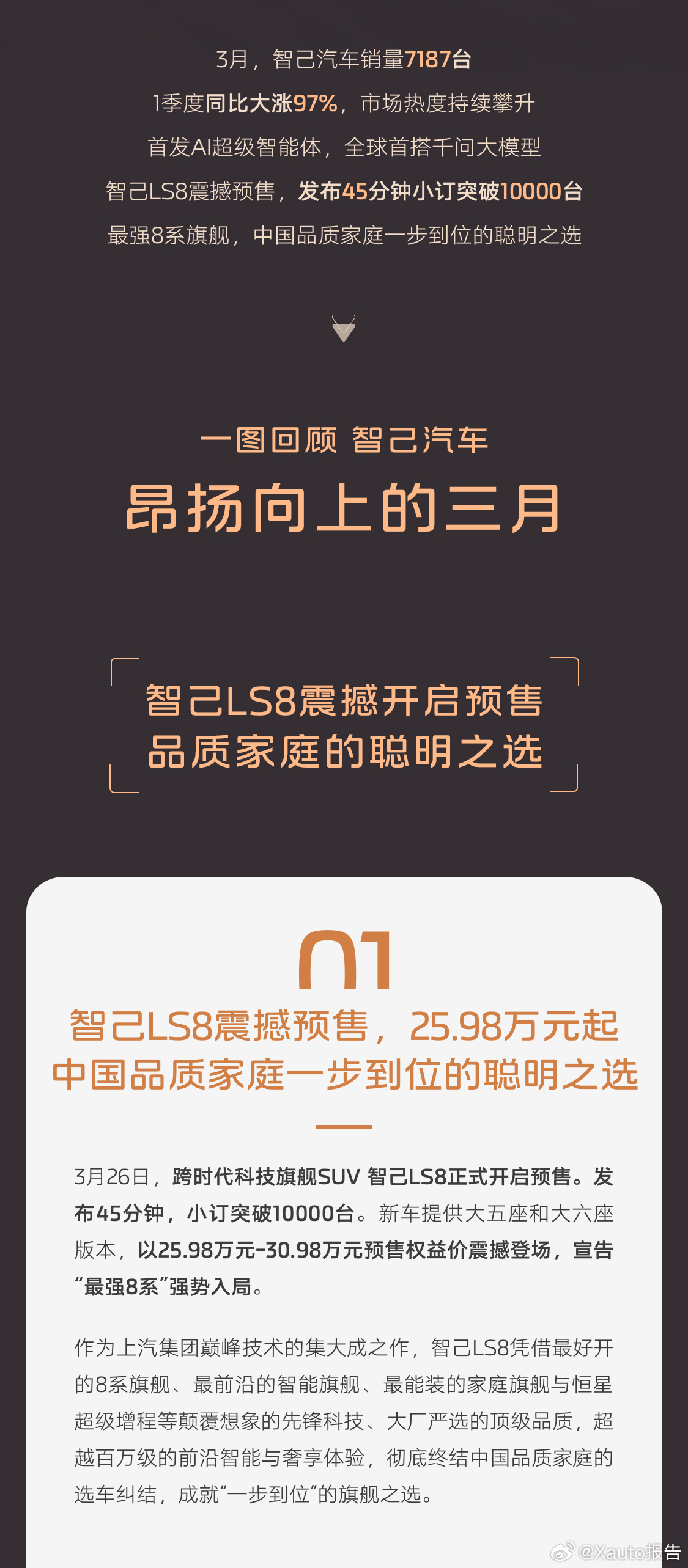 智己汽车3月销售7187台,一季度同比大涨97%,智己LS8 25.98万起火爆预售中,中国品质家庭一步到位的聪明之选,4月16日震撼上市,敬请期待!智己ls8震撼预售25.98万元起智己汽车新能源汽车