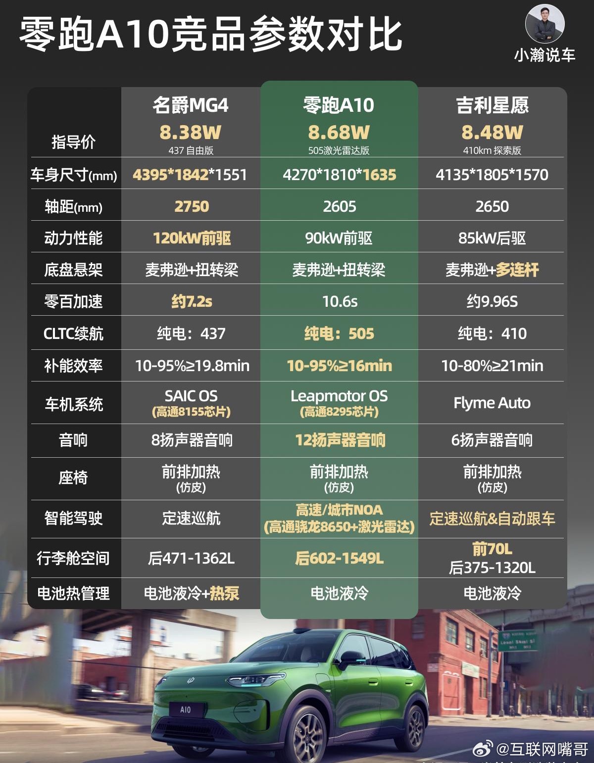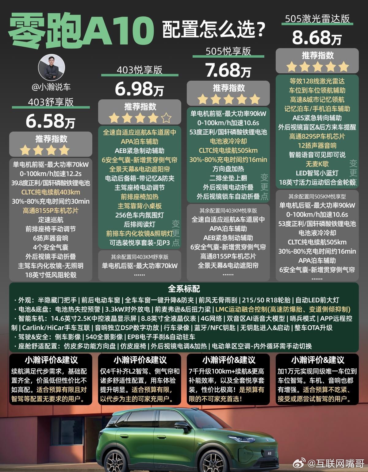 零跑的纯电小型SUV在没有预售的情况下直接上市了!售价6.58-8.68万!带500km+续航、带激光雷达智驾、还免费赠送7kW充电桩,这个价格小瀚看了这么多小车也是相当震惊了!💰配置解读:入门版就有400km+的续航和8155车机芯片。加价4千元升级到403悦享版即可拥有L2级驾驶辅助、天幕遮阳帘等一众舒适配置。再加7千元可将续航升级至500km+,并显著提高补能速度,且升级液冷以提高电池寿命。而高配的505激光雷达版更是能在仅8万的价位实现车位到车位领航辅助!🚗配置推荐:虽然入门的两个版本和同级在售车型比已经很有竞争力,甚至可以说拉低了很多宝子的购车门槛。但考虑到A10全系没热泵,小瀚建议只要预算不太吃紧,都从505悦享版选起。而车技不好的或者需要跑高速的宝子,非常推荐上505激光雷达版(至少硬件足够给力,智驾具体表现怎么样,小瀚后面拍视频给大家测下)。💡竞争力评价:零跑A10的价格一出,可以说除非你裸车预算能到9万以上,依然可以考虑宁德电池+视觉智驾的MG4智趣版,否则零跑A10真的可以无脑冲了。以它的空间、配置、甚至实车质感,除非同级的星愿、海豚、元up在改款前的终端价格特别给力,否则零跑A10就是今年上半年zui值得推荐小车!