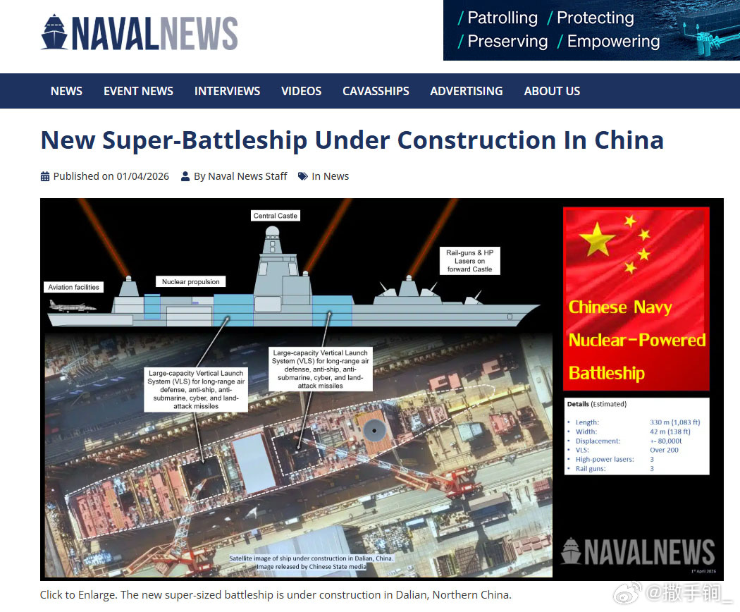 《海军新闻》在愚人节煞有介事地开了个玩笑,说北方大船不是航母,而是排水量8万吨的超大型核动力战列舰,两个大型方形空间将配备超过200个VLS单元。此外还将装3门电磁炮。。。