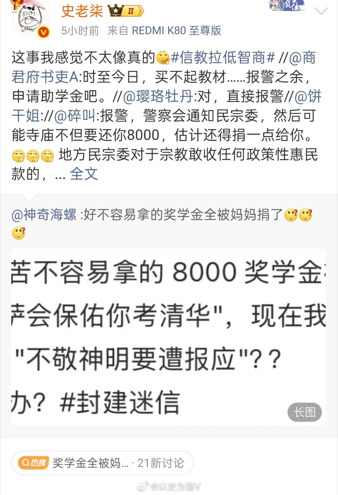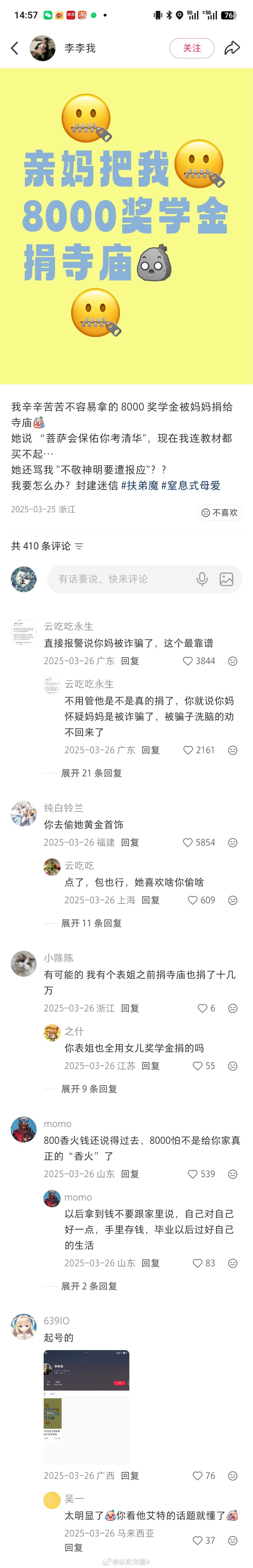 刚刚在首页刷到一个说自己辛辛苦苦挣了8000奖学金,结果被家长捐给庙里了……