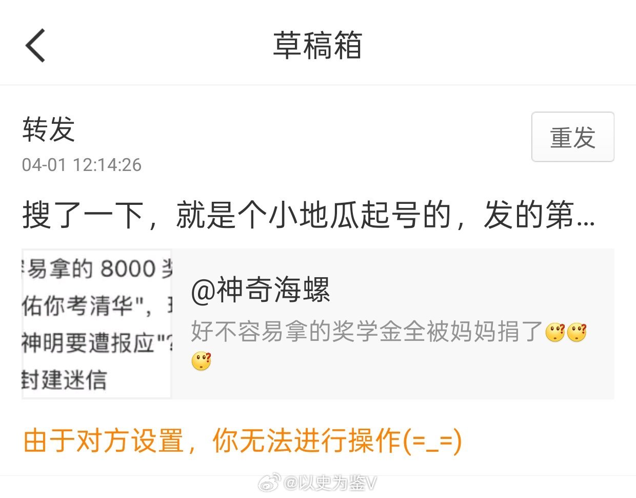 得,一条还是中学生/大学生要考清华,一条就又开始创业了……这明显就是靠挑动对立情绪起号的啊,看看原贴带的啥话题就知道了,于是我转发说这是起号的,结果转发失败,再一看原博拉黑我了。