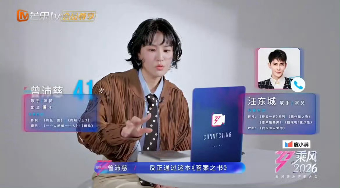 汪东城说曾沛慈不可以输 哈哈哈汪东城中二魂,听到曾沛慈说眼前有一本答案之书,立马否定:“我想说你一定赢,怎么能输呢?导演组,给我们换一本‘赢’!”乘风2026