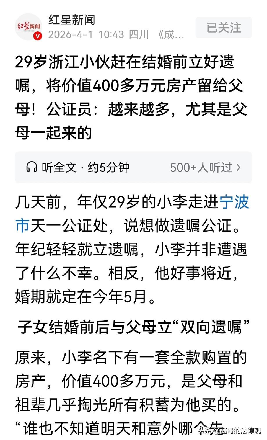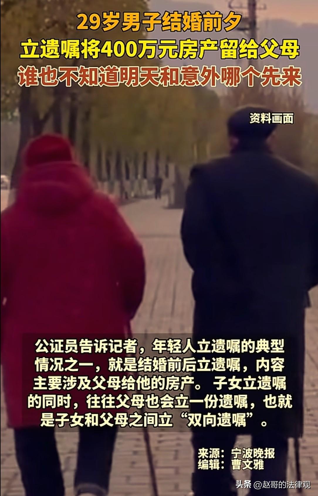 是人间清醒还是自私?浙江宁波,29岁的小伙,婚期就定在下个月,本该喜气洋洋筹备婚礼,可他却去了公证处要立遗嘱,29岁正壮年就立遗嘱,连工作人员都愣了。小伙表明:要把自己名下价值400多万的房产,在自己万一遭遇不测之后留给父母,让父母再晚年不至于流离失所。网友:小伙是人间清醒! 小李名下有一套全款购置的房产,价值超过400万元。 房子并不是他自己挣来的,而是父母和祖辈几乎掏空了所有积蓄,给他置办下的。 在父母的观念里,倾其所有给孩子买房,这房子以后自然就是孩子的,孩子再传给下一代,天经地义。 可小李却不这么想,因为谁也不知道明天和意外哪个先来。 婚后万一自己遭遇什么不测,又没有孩子,房子不能全份额的落到父母手里。 于是,他决定立个遗嘱,确保万一自己出了状况,将名下的房产还给父母。 让父母在晚年有一套自己的房子,作为安身之处。 其实,像他这样在结婚前后立遗嘱的年轻人,并非个例。 近几年,年轻人立遗嘱的现象越来越普遍,公证员就说,年轻人立遗嘱的咨询电话每天都有。 还有的父母直接陪着孩子一起来的,这种情况的出现,其实背后有着现实的考量。 很多独生子女家庭,父母都认为,家里就一个孩子,老了以后家产自然全是他的,根本不用立遗嘱。 可身边就有很多例子,子女在婚内继承的财产,属于夫妻共同财产。 也就是说,父母辛苦留下的房屋财产本意是留给儿子,其实有一半是儿媳的。 如果留给独生女儿,那么就有一半是属于女婿的。 这跟绝大多数父母想把家产,全留给自己孩子的心意完全对不上。 那么,只有遗嘱里明确写上:我的财产只归我的孩子个人所有,与其配偶无关,这份财产,才真正归自己的孩子所有。 小李要做的遗嘱公证,恰恰就是这一类。 所以,为了避免出现这种情况,立遗嘱,就成了很多年轻人的选择。 而且,很多年轻人在立遗嘱的时候,还会和父母同时立下双向遗嘱。 也就是说,子女立遗嘱,把自己的财产留给父母继承。 儿父母则指定,财产只给孩子个人继承,不作为其与配偶的共同财产。 这样一来,既保障了父母的权益,也确保了孩子的财产不会因为婚姻关系而外流。 这种做法看似有些“算计”,但其实是年轻人对自己和家人负责的一种体现。 除了结婚前后立遗嘱这种情况,还有一部分不婚不育的年轻人,也会选择立遗嘱。 这部分人中,有的和父母一方关系不好,就会立遗嘱把财产单独留给另一方。 也有人觉得,朋友在自己生命中扮演了重要角色,会选择把财产留给朋友。 不过,立下的遗嘱也并非不可更改。 但还有一个很多人都忽略了的法律细节。 比如小李,现在没有孩子,可万一以后有了孩子,他婚前立的这份遗嘱,可能就会部分失效。 因为遗嘱中,他未给孩子保留必要的份额,到时候法律会自动修正。 也就是说,小李婚前立遗嘱把房子留给父母,后来生了孩子。 如果意外发生,法律会先为孩子保留必要的遗产份额,剩下的部分,再按遗嘱执行。 意思是,如果一个人婚前立遗嘱把房子留给父母,婚后生了孩子,原来的遗嘱,在法律上已经不能完全按照他的意愿执行了。 因为,孩子未成年,法律有义务保障他们的基本生活需求。 所以,年轻人在立遗嘱的时候,一定要考虑到家庭结构的变化,及时更新遗嘱内容,以免出现不必要的纠纷。 依据《民法典》第1141条:遗嘱应当为缺乏劳动能力又没有生活来源的继承人保留必要的遗产份额。 现实中,像未成年人、精神或身体有残疾无法工作的人等,他们没有能力自己挣钱养活自己,也没有稳定的收入来源。 如果遗嘱人把财产都分给了其他人,这些弱势群体就可能生活无以为继。 所以法律规定,遗嘱必须要给他们留下一部分财产,确保他们能有基本的生活保障,不至于陷入生活困境。 本案中,小李婚前立遗嘱,要把房产留给父母,确实是他的个人意愿,也是对父母的一种保障。 但如果他婚后有了孩子,孩子在他去世时还未成年,那么他之前的遗嘱,就不能完全按原计划执行。 要先从房产中留出一部分,给孩子作为必要份额,剩下的才会按照遗嘱分给父母,这是法律未成年人权益的保护。 对婚前立遗嘱这事,每个人的看法还真大有不同。 有人认为,对即将结婚的双方来说,男方太自私,立遗嘱不是不行,但最起码婚前要给女方说明,这是尊重。 特意婚前隐瞒,那女方也没必要怀孕生孩子,因为怀孕生子对身体造成不可逆的伤害,大家都不用付出什么,这样才公平。 当然也有人认为,小李做么做是人间清醒。 那么,你对婚前立遗嘱把房产留给父母,这样的事有什么看法?