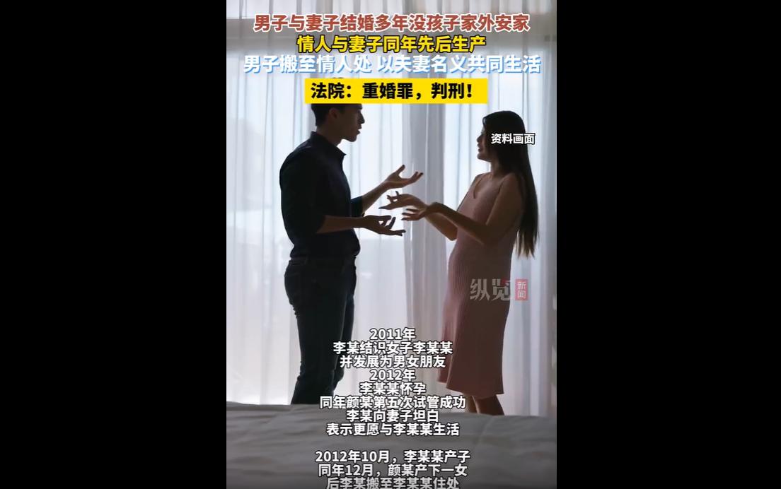 海口男子李某与颜某2003年结婚,因颜某难孕,李某多次陪同其做试管,前四次均失败。 2011年李某结识李某某并交往,2012年李某某怀孕,同年颜某第五次试管成功,李某搬至李某某住处以夫妻名义同居生子。 2024年双方离婚,颜某报警,李某自首,被判处有期徒刑一年、缓刑一年六个月。 不可否认,李某与颜某的婚姻,从一开始就承载着“生育”的压力。 颜某婚后难孕,夫妻二人共同面对,李某多次陪同妻子做试管婴儿手术,前四次的失败,不仅消耗着夫妻二人的精力与财力,也可能让李某心中积累了失望与焦虑。 这份求子心切的心情,或许能让人理解,但这绝不能成为他突破婚姻底线、触犯法律的借口。 生育固然是很多家庭的期盼,但婚姻的核心是忠诚与陪伴,而非单纯的“传宗接代”,面对生育困境,夫妻应携手并肩、共同寻找解决办法,而非选择逃避与背叛。 李某的行为,既伤害了妻子颜某,也辜负了自己的婚姻与责任。 2012年,在颜某第五次试管成功、即将迎来孩子的关键时刻,李某却选择向妻子坦白自己与他人的私情,甚至搬至情人住处,以夫妻名义共同生活,仅偶尔回家探望女儿。 这份背叛,对刚刚经历五次试管、终于如愿怀孕的颜某来说,无疑是致命的打击。 她多年的坚持与付出,换来的却是丈夫的移情别恋与婚内背叛,这种伤害,不仅是情感上的,更是精神上的重创。 而李某与情人的同居生子,更是直接触犯了法律,构成重婚罪,最终受到法律的制裁,实属必然。 从法律层面来说,婚姻受法律保护,忠诚是夫妻双方的法定义务。 我国法律明确规定,有配偶而重婚的,或者明知他人有配偶而与之结婚的,构成重婚罪,将依法追究刑事责任。 李某在与颜某婚姻关系存续期间,与李某某以夫妻名义共同生活并生子,其行为已经明确构成重婚罪,法院的判决,既维护了法律的尊严,也给所有已婚人士敲响了警钟:法律不容挑衅,婚姻底线不可逾越。 即便李某有自首、认罪认罚的情节,获得了缓刑,也无法抹去他背叛婚姻、触犯法律的事实。 现实生活中,有些人事先婚姻的责任与义务,将婚姻视为“满足个人需求”的工具,一旦遇到困难或不如意,就选择逃避、背叛,却忽视了婚姻背后的责任与担当。 李某因生育问题选择背叛妻子,看似是“无奈之举”,实则是对婚姻的不尊重、对法律的漠视。 婚姻从来不是一场“儿戏”,而是一份需要双方共同坚守、彼此包容的承诺,无论是生育困境,还是生活中的其他矛盾,都应通过沟通、协商解决,而非用背叛的方式逃避问题。