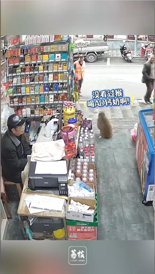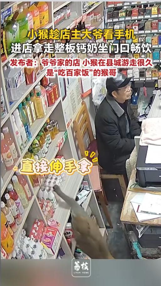 “看什么看没见过啊!”近日,贵州贵阳,爷爷正玩着手机看着店,门外边一只猴子大摇大摆爬了进来,直接在货架子上掏走了一板AD钙奶,然后坐在门口喝了起来,引得不少路人侧目。爷爷沉迷于手机,竟然丝毫没有察觉!网友:没人给钱,亏了! 人与自然也是越来越和谐了,很多时候,野生动物闯进人类社会,只要是危险性不大的,一般也就轻轻驱赶,让专业人士放归野外,有一些也能靠着人们的投喂,直接在城镇里生活。 据媒体3月31日报道,这只小猴子在县城里面游走了挺长时间,靠着吃群众的“百家饭”生活。事发当日,它闯进了爷爷的小店。 那个时候,爷爷正在看手机,注意力不是很集中,而且柜台又遮挡了小猴的身影,以至于小猴子进来掏东西的整个过程,爷爷都没有察觉。 原本以为猴子拿了就走,没想到它实在是太嚣张,直接搁店铺门口就喝了起来,还吸引了路人跟环卫工围观。猴子对人们的围观似乎感到不爽,叼着AD钙就走开了。爷爷就在这不知不觉中,痛失了一板饮料。 网友看后表示,还好就来了这一次,多来几次,爷爷不得破产啊!虽然看着可爱,还是请相关部门把它送回野外吧,整日在县城里流浪,万一伤了孩子,对谁都不好! 信息来源:《小猴趁店主大爷看手机 进店拿走整板钙奶坐门口畅饮 发布者:爷爷家的店 小猴在县城游走很久 是"吃百家饭”的猴哥》荔枝新闻