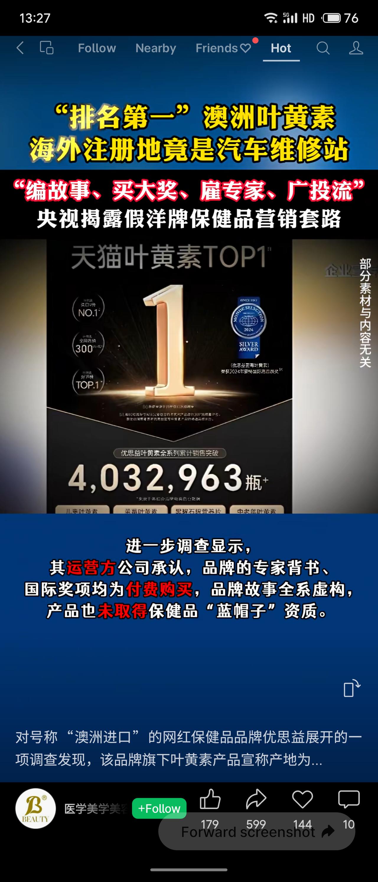 央视曝光“澳洲优思益”叶黄素为假洋牌:海外注册地实为汽车维修站,品牌故事、专家背书、国际奖项均系付费虚构,产品未获“蓝帽子”资质。其靠编故事、买奖项、投流成为爆款,业内指此类乱象让平台获利、消费者买单。
