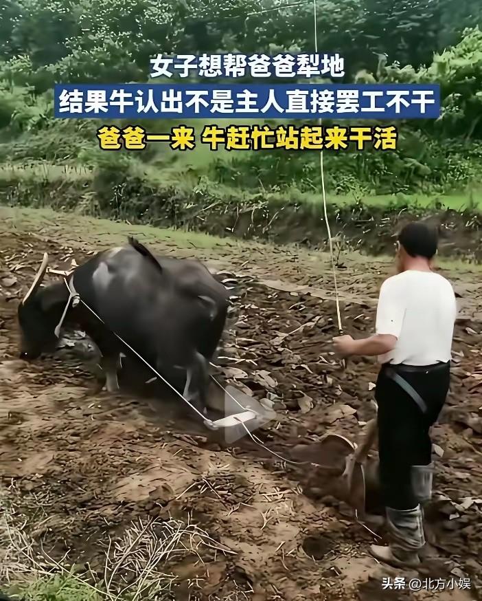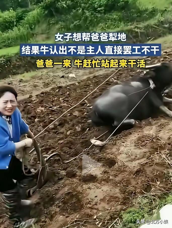 女儿想要帮爸爸犁地,结果牛根本就不配合,最后索性直接趴在地上罢工不走了,女子是怎么商量牛都是无济于事。 然而,爸爸一来,牛见到爸爸来了,牛马上站了起来埋头犁地,丝毫没有犹豫,加着劲干起了活。 有的网友说:牛也会罢工啊!一看不是老板,直接撂挑子不干了。[捂脸] 牛是有灵性的,知道谁才是自己的老板,谁给自己“发工资”![笑哭]