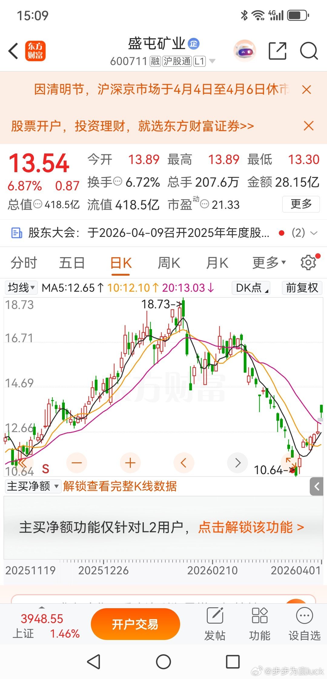 盛屯矿业,在这里我必须锁定利润了盛屯矿业,有朋友说上涨才刚刚开始,但是我认为这里就是我离场的位置。我是在3月24日分两批进场的,因为我认为他这一波的下跌特别的流畅,3月24日突然跳空大涨,这是一个强烈的买入信号,虽然我平时很少追涨,但遇到这个机会,我也是当仁不让的。今天有色、资源方向并没有出现集体大涨,更多的票是高开低走,盛屯矿业能有7个点的涨幅,这个要归根于他的一季报。基本面上一季报业绩已经披露,技术面已经反弹了跌幅的一半,股价也来到30日线和120日线的压力位。短期在往上不是不可能,但是风险是明显加大,我要说的是低风险收益, 不是来拼命的,一周20个点,有何不满意。欢迎加入我们的免费交流群财经股票