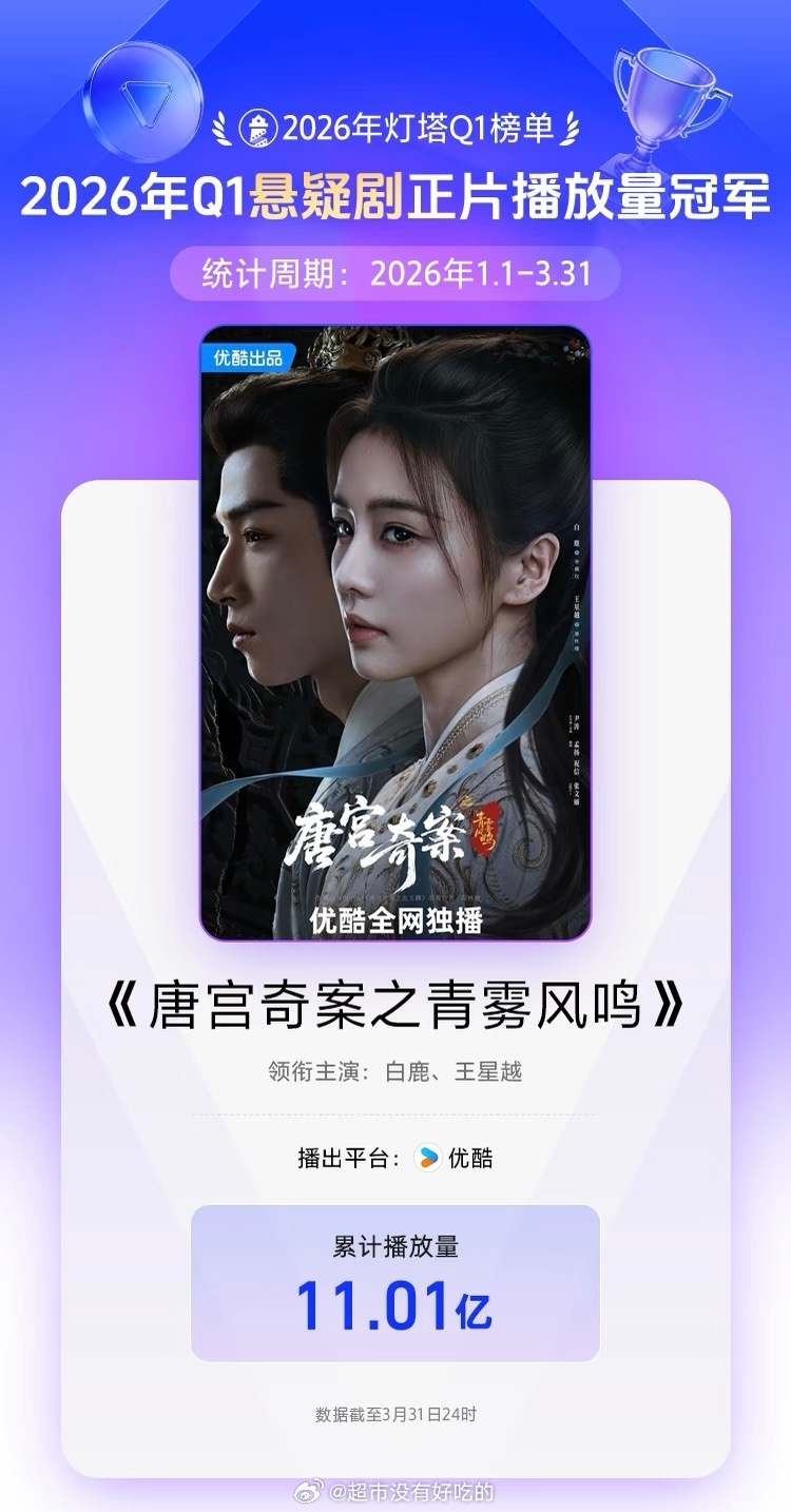 白鹿唐宫奇案Q1悬疑剧正片播放量冠军唐宫奇案Q1正片播放量累计11.01亿拿下2026年Q1悬疑剧正片播放量冠军🎉白鹿优秀白鹿白鹿