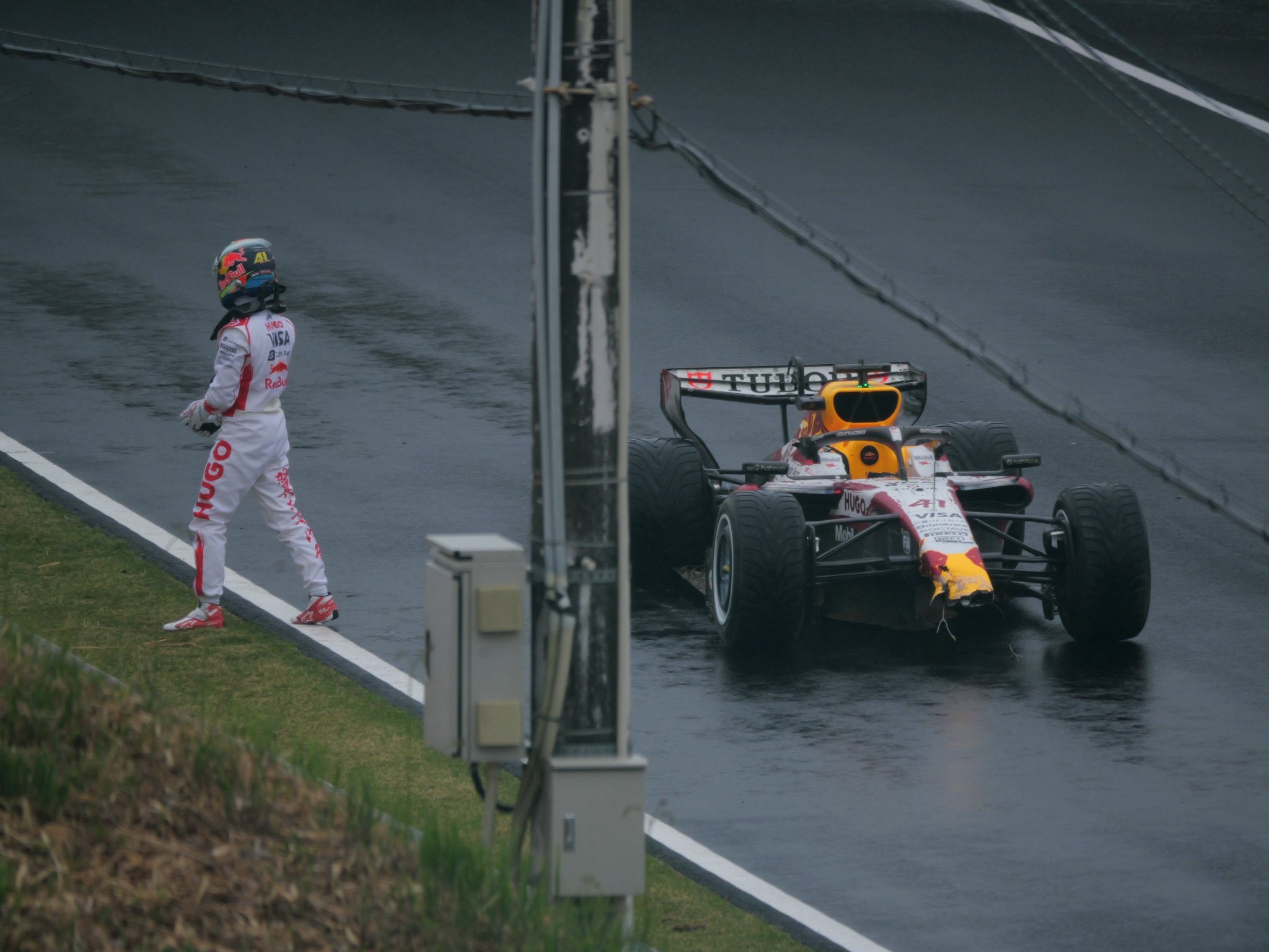 这不是愚人节玩笑,林德布拉德驾驶小红牛车队赛车在铃鹿赛道进行倍耐力轮胎测试时,因赛道湿滑导致发生碰撞F1赛车
