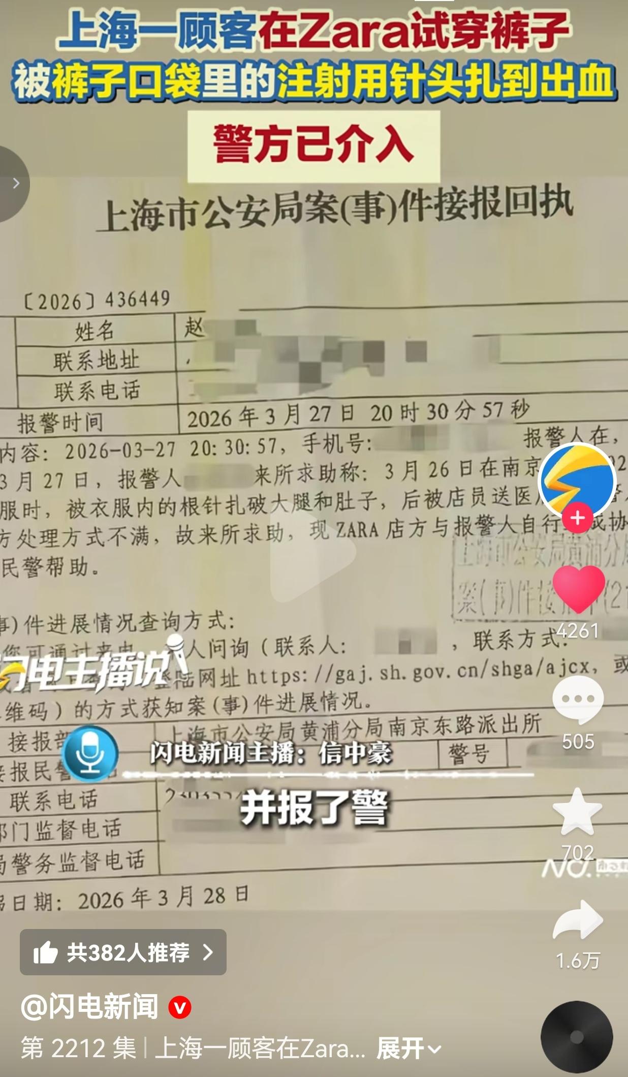 后背发凉!一女子去商场买条裤子,竟然能被裤兜里的注射针头扎得鲜血直流?!这不是恐怖片,是3月26日发生在上海ZARA门店的真事! 事情是这样的:3月26日晚,上海一位赵女士(化名),去南京东路附近的ZARA门店逛街,看中了一条裤子,就进试衣间试穿。 可她刚把裤子穿上,突然感觉肚子和大腿一阵刺痛!低头一看,裤子已经被扎出了血印,鲜血直接渗了出来! 她赶紧把裤子脱下来检查,结果在裤子的内口袋里,发现了一根足足几厘米长的注射用针头!这根针直接刺穿了口袋,狠狠扎进了她的身体! 赵女士当场就懵了,立刻喊来了店员。店员陪着她去了医院,做了抽血检查,排查乙肝、艾滋等传染病风险。 可更让人气愤的是,后续的处理让赵女士彻底寒心。她对店方的解决方案完全不满意,直接报警求助。 从报警回执上能清清楚楚看到:赵女士3月27日正式报案,警方已经介入调查。而ZARA门店工作人员只轻飘飘说了一句“公司正在配合处理”,连一句像样的道歉和实质性的赔偿方案都没有! 你想一下:一根带血的注射针头,藏在待售的商品里,这是多大的安全隐患?这是拿顾客的命开玩笑吗?! 谁能保证这根针头上没有病毒?谁能保证下一个试穿这条裤子的人,不会被扎伤? 这已经不是简单的“疏忽”了,完全是对消费者安全的极度不负责!  网友看到后评论说:我上周刚在ZARA买了裤子!看完直接原地去世,现在就去把裤子剪了检查!太吓人了! 也有的网友说:我的天!以后谁敢带孩子去快时尚品牌试衣服?这要是扎到孩子,后果不堪设想!ZARA必须给个说法! 还有的网友说:这绝对不是意外!针头怎么会跑到待售裤子里?是有人恶意投放?还是品控完全为零?必须严查!  说实话,我看完这个新闻,气得浑身发抖,后背直冒凉气。 我们去商场买衣服,图的是开心、是放心,可谁能想到,试衣间里竟然藏着这样的“致命陷阱”? 一根几厘米的注射针头,扎进去的不只是皮肉,更是所有消费者对这个品牌、对整个快时尚行业的信任! 最让人细思极恐的是:这根针头是怎么来的?是上一个试穿的顾客恶意留下的?还是生产环节就出了问题?还是有人故意投放在店里? 不管是哪种情况,ZARA作为品牌方,都难辞其咎! 你卖的是衣服,不是凶器!你有义务、有责任,在商品上架前,把每一件衣服都检查清楚,把所有安全隐患都排除! 可现在呢?一根明晃晃的针头,就这么堂而皇之地出现在待售裤子里,扎伤了顾客,你一句“正在配合处理”就想了事? 我们消费者,不是你品牌的试验品,更不是你敷衍了事的对象! 被针头扎伤,不是小事!这意味着要面临传染病的风险,要承受巨大的心理恐惧,要一次次跑医院做检查! 这种精神和身体的双重伤害,是一句轻飘飘的道歉就能弥补的吗? 这件事,绝不能就这么算了!我们要的不是ZARA的公关话术,不是敷衍的赔偿,我们要的是彻查!要的是真相!要的是所有消费者的安全保障! 我们要让所有品牌都清醒:不把消费者安全放在心上,早晚被市场抛弃! 最后,我想说的是:对消费者安全的漠视,是品牌最致命的“毒针”!守护消费安全,就是守护我们每个人的底线! 对此,你怎么看?