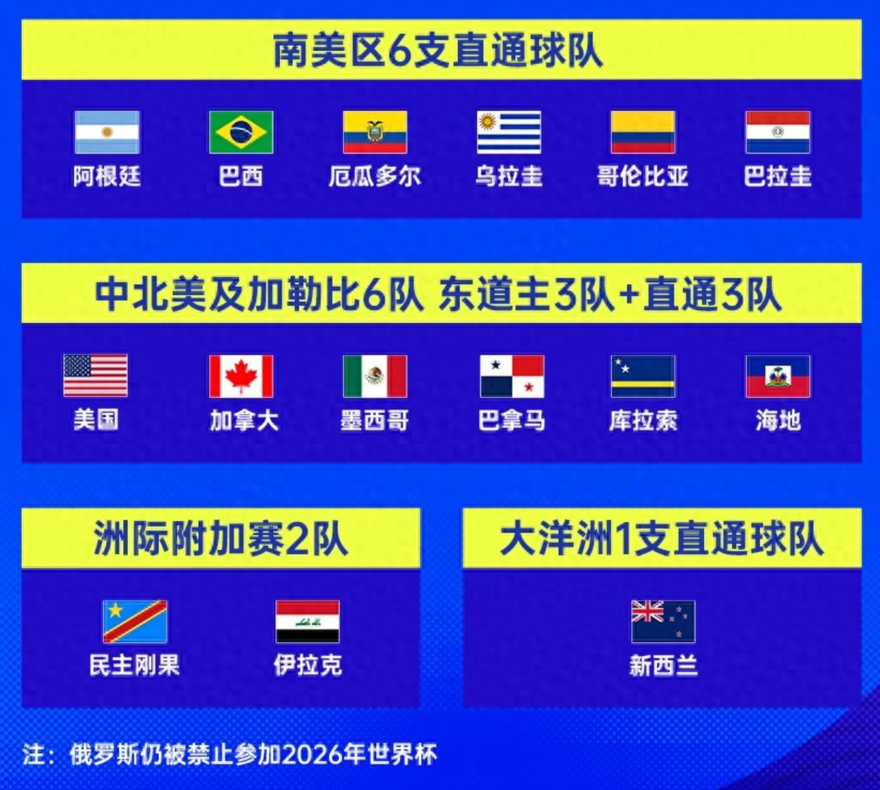 世界杯分区的几个不合理: 1、欧洲,俄罗斯不能参加。以色列可以参加,俄罗斯不能参加,不合理。 2、非洲,非洲不熟悉。 3、亚洲,澳大利亚分在亚洲不合理。新西兰算大洋洲,澳大利亚为什么算亚洲? 4、美洲,加拿大能够凭借主办方的资格,直接进入世界杯决赛圈,不合理。如果是这样,我们也可以主办。 5、大洋洲,新西兰作为大洋洲唯一的球队,直通决赛圈不合理。应该让澳大利亚跟新西兰争夺一个名额。 最大的不合理,就是澳大利亚不该算到亚洲,应该算到大洋洲,就像土耳其算欧洲,俄罗斯算欧洲是一个道理。