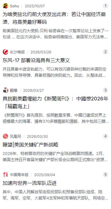 对付中国,不是去和它打仗!美国驻北约前大使说:中国有庞大的陆军、海军和空军,以及数量不明的导弹、核武器,现在与它发生直接军事对抗,已没有取胜的把握。美国前驻北约大使凯·贝利·哈奇森曾经在公开场合直言,中国军力规模和导弹核力量已让直接开战变得没把握取胜,这话一出,立刻戳破了某些人军事硬刚的幻想。 麻烦看官老爷们右上角点击一下“关注”,既方便您进行讨论和分享,又能给您带来更多优质的内容,感谢您的支持! 哈奇森的看法,其实也代表了不少美国战略界人士的焦虑。她看得很清楚,中国的军力发展不是单点突破,而是整个体系的升级。以前美军在西太平洋可以来去自由,觉得靠几艘航母就能摆平一切,但现在不一样了。中国的反舰弹道导弹,比如被外媒常提起的东风-21D和东风-26,早就不是秘密了,再加上近几年亮相的高超音速武器,比如东风-17,速度能达到10马赫,还能在大气层边缘打水漂式飞行,现有的防空系统基本拦不住。这玩意儿部署在东南沿海,就意味着美国航母得离得远远的,两千公里之内都不安全。这就是他们常说的区域拒止体系,说白了,就是让你没法像以前那样,随随便便就把兵力投送到我家门口来。 除了这些不让别人靠近的“盾”,中国手里还有很锋利的“矛”。就拿海军来说,美国媒体自己都承认,按舰艇数量算,中国海军已经是全球规模最大的了,有超过370艘舰艇和潜艇。这些年我们常说的“下饺子”,可不是开玩笑的。从055万吨大驱到075两栖攻击舰,再到电磁弹射的福建舰,这一整套下来,中国海军已经不是过去那支只能在近海防御的力量了。去年9月的抗战胜利80周年阅兵,大家也都看到了,从隐身战斗机到各种无人机,从新型洲际导弹到反导系统,拉出来展示的都是国产现役的主战装备,信息化和智能化程度相当高。这就不是简单的数量堆砌,而是实实在在的战斗力生成。 这种力量对比的变化,让美国军方内部也开始重新算账。五角大楼每年都要出一份中国军力报告,最新的那份报告里就直说,中国军队正在变得越来越精干,也越来越有韧性,美国本土甚至都感觉到了“日益脆弱”。这话放在十年前,几乎是不可想象的。所以,哈奇森的言论之所以能戳破一些人的幻想,就是因为她点明了这个现实:中国已经具备了战略抗衡的能力。这意味着,如果美国非要硬碰硬,不仅没有取胜的把握,还要付出承受不起的代价。 正是因为军事这张牌不好使了,美国的策略才开始转向。现在他们更热衷于搞什么经济、科技和联盟体系的竞争。比如他们现在搞的“关键矿产战略”,就是想方设法要把稀土、锂、钴这些战略物资的供应链,从中国剥离出去,拉拢盟友另搞一套。还有在人工智能领域,特朗普政府这两年推出了个“AI行动计划”,一边砸钱搞技术,一边拉拢盟友建立排他性的技术标准,说白了就是想在高科技领域筑起一道墙,把中国挡在外面。 当然,哈奇森自己也看得明白,这种策略转变其实也反映了全球力量平衡正在发生变化。中国的军力发展,本质上是为了保障自己的安全和发展利益,并不是为了跟谁争霸。反过来想,正是因为军事对抗的成本高到双方都难以承受,反而让大国之间爆发直接冲突的可能性降低了。毕竟,谁也不想打个两败俱伤,让第三方捡了便宜。 回过头看哈奇森的那番话,她虽然是个美国政客,但至少对现实有清醒的认知。她看到了中国军力的体系化优势,也看到了美国在远距离投送上的劣势。这种认知,在美国内部也引发了很多讨论。越来越多的军事专家开始承认,中国已经不是那个可以随意拿捏的对手了。所以,美国现在的思路就是,既然硬的不行,那就来软的,用经济、科技和联盟的手段来遏制中国的发展。 但这条路真的走得通吗?恐怕也不好说。美国想拉着盟友一起跟中国经济脱钩,但欧洲那些国家跟中国的贸易往来太深了,2023年中欧贸易额还有八千多亿美元,德国车企在中国市场赚得盆满钵满,法国也想多卖点农产品,要让他们为了美国的利益自断财路,难度不是一般的大。而且,美国自己国内也是一堆问题,国债都突破35万亿美元了,通胀压力也不小,哪还有那么多余粮去到处撒钱搞对抗。 所以说,哈奇森的这个表态,与其说是什么高明的战略构想,不如说是在现实面前的一种无奈调整。她的发言背后,其实藏着美国政客们对中国崛起的深深焦虑。他们担心中国经济总量超过美国,担心军事科技被中国赶超,更担心自己的全球领导地位受到挑战。这种焦虑感,在他们近期的一系列对华政策里都能看得出来,从贸易战到科技封锁,再到拉帮结派搞“印太战略”,本质上都是这种心态的体现。 对于我们来说,听到这些来自对手的“客观评价”,其实也是一种警醒。一方面,这说明我们的国防现代化建设确实取得了成效,让对手不得不重新掂量;另一方面,也要清醒地认识到,人家只是换了一种方式来较劲。从军事上的威慑,转向经济和技术上的围堵,这场大国博弈的烈度不仅没有降低,反而在向更深更广的领域延伸。