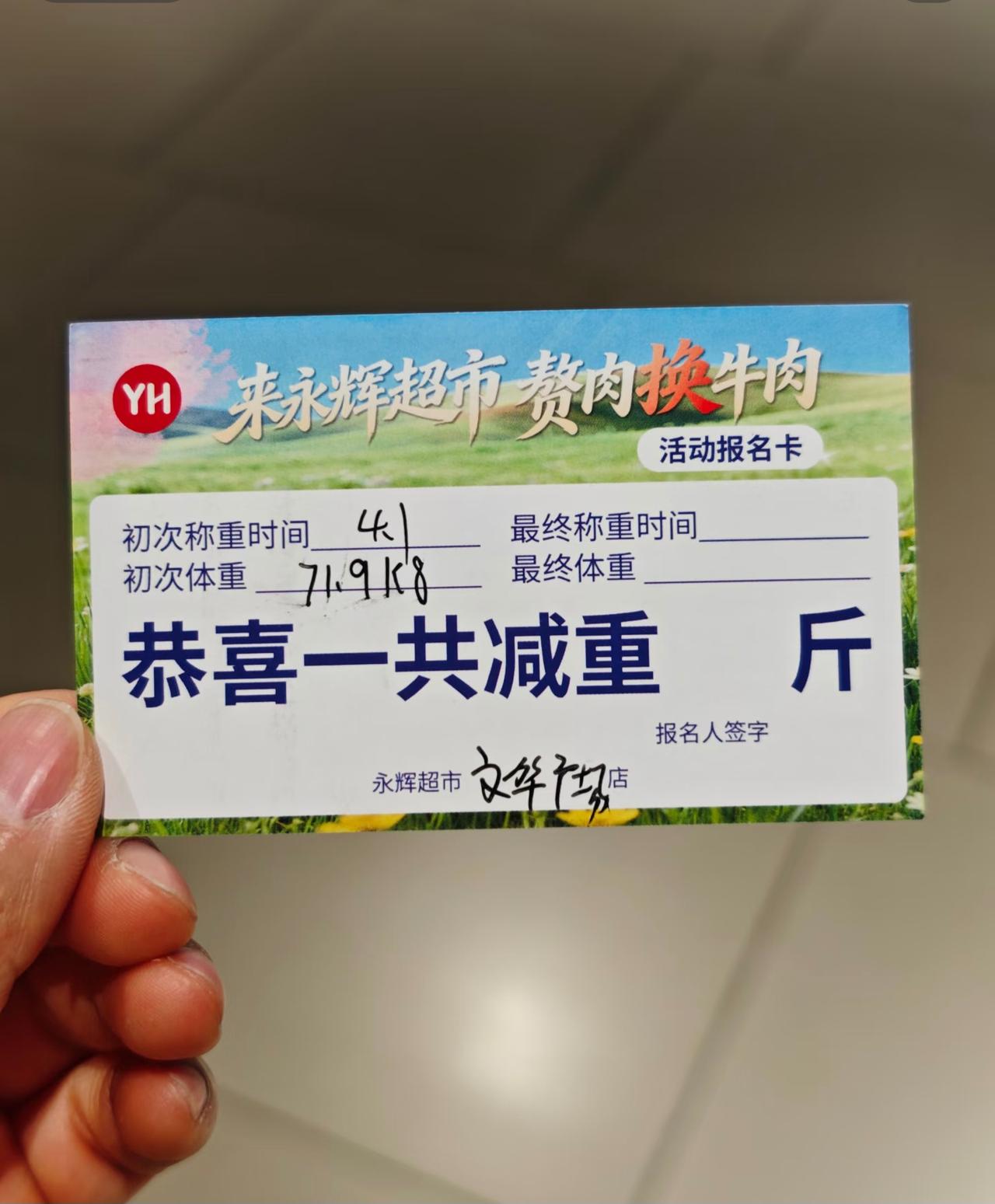 永辉超市这波操作太6啦! 以前只听说过拿旧手机换盆, 可你听过拿赘肉换牛肉吗! 这不永辉超市这个月 就推出了用赘肉换牛肉的活动。 从4月1日到4月30日期间, 每减下3斤身上的赘肉, 就能到超市换一斤牛肉。 而且是多减多得, 每人封顶可以换3斤! 说实话这个活动还是蛮吸引我的, 本身就有减肥的想法, 这一下子动力不就来了嘛! 而且活动流程也很简单, 4.1到4.9期间带身份证到客服台报名称重, 10号到月底即可称重兑换。 羊毛不薅白不薅, 既能瘦下来, 还能把牛肉带回家, 简直是减脂期的双重快乐! 有没有已经报名的朋友, 评论区可以举个手哦! 永辉超市 超市活动 活动