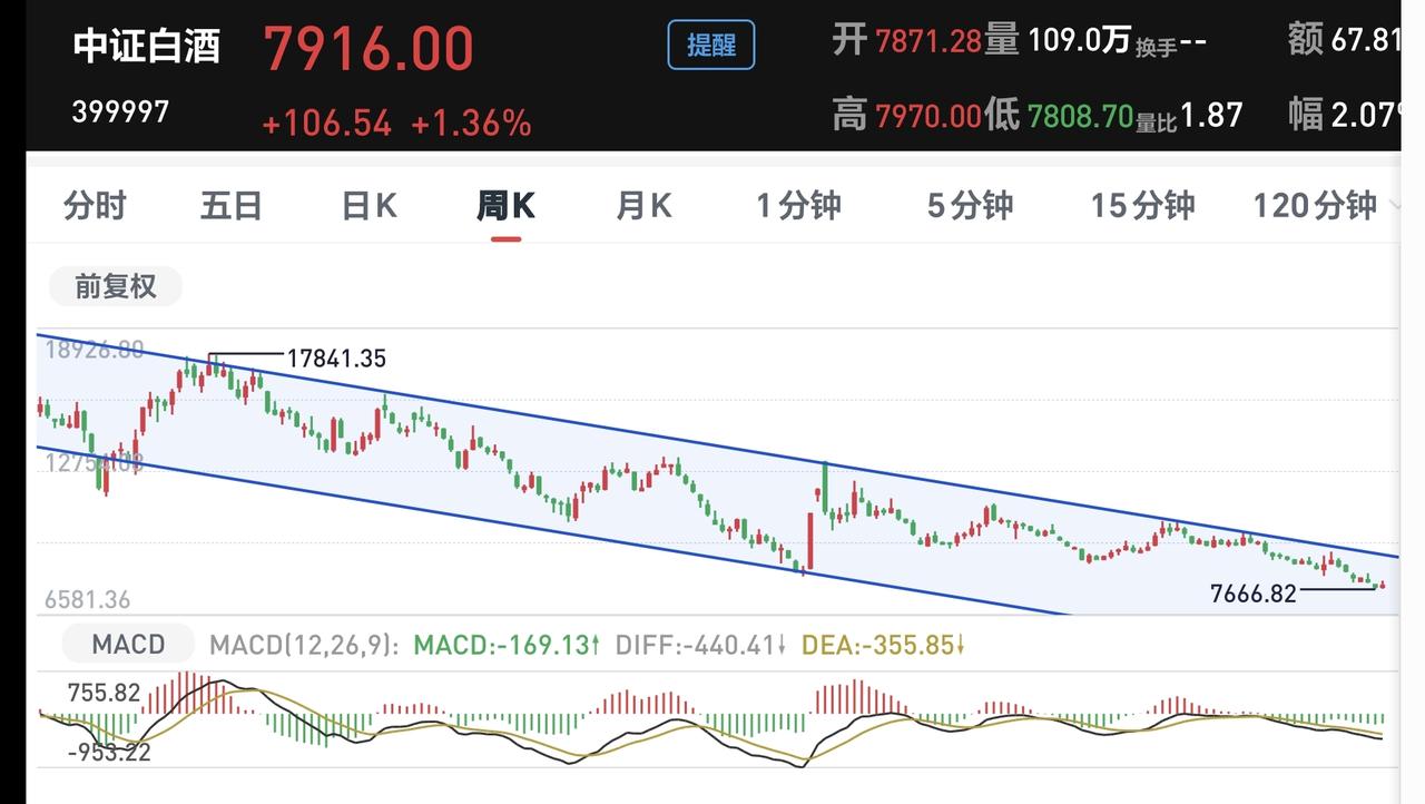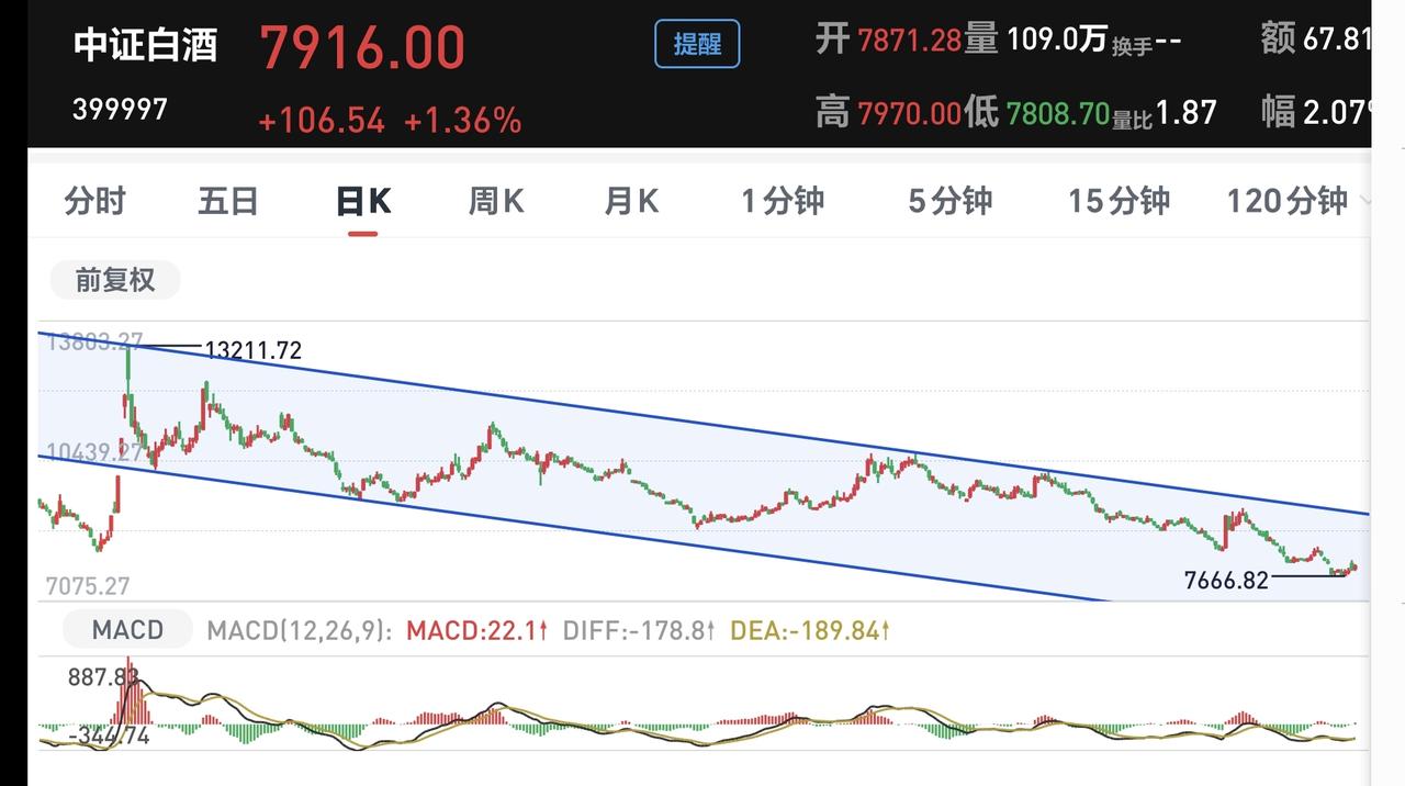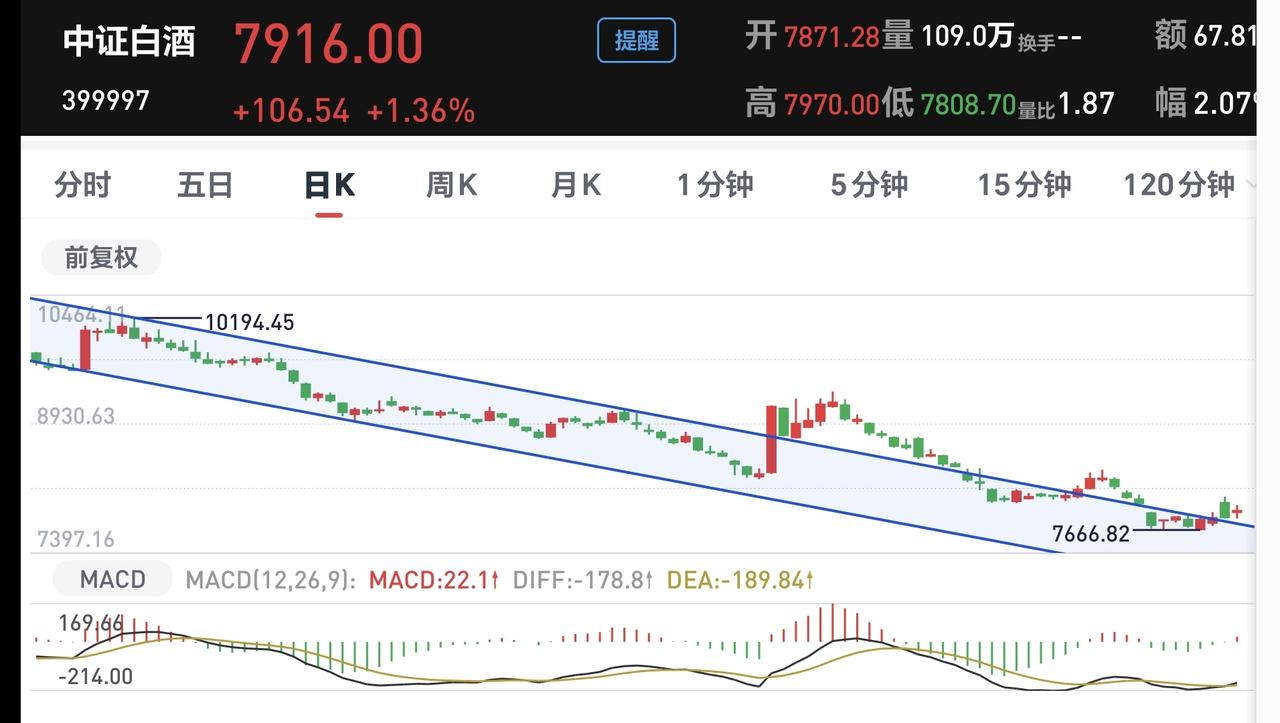 基金:白酒板块上涨,是不是已经反转 白酒板块今天也是上涨,盘中估值上涨了1.20%,持有人数在所有板块当中排名第15位。 白酒板块近三个月以来下跌了7.94%,近六个月以来下跌了13.65%,近一年以来下跌了13.02%,近三年以来下跌了35.28%,这个板块的基金情况见下面的截图6,上面有这个板块各只基金近一个月以来的涨跌情况。 看下面的截图7,这是白酒板块日K线图,这也是我最近一段时间经常画给大家看的一张截图,前段时间已经两次突破了这个下跌通道的上轨线,但现在看都是假突破,现在的突破是第三次突破,这个突破还需要观察是不是真突破。 白酒板块日线级别的情况和创新药板块日线级别的情况是一样的,我最近都是画的日线级别短期下跌通道,但真正要看这个板块的反转,还需要看时间段相对长的日线级别下跌通道,下面的截图8就是白酒板块日线级别时间段相对长的下跌通道,在这个下跌通道内,现在的位置距离下跌通道的上轨线还比较远,距离日线级别的趋势反转还有很大的空间,这个板块日线级别的反转还是任重道远,小幅度的上涨都改变不了这个板块日线级别的下跌趋势。 我最近一段时间,把白酒板块和创新药板块日线级别下跌通道的时间段都画的很短,目的就是要增强大家的信心,让大家在低位区域不要害怕,这就像我在前两年市场处于低位区域的时候,经常都会说有中大阳线一样,那也是为了给大家增强信心,我现在就很少说有中大阳线,我就是担心大家在低位区域把筹码扔掉。 上一篇文章讲的是创新药板块,我把日线级别时间段拉长,目的是怕大家在这个位置追涨,因为现在创新药板块经过连续上涨以后,已经来到了比较大的压力位置附近,这个时候可以定投,这个时候可以持有,但这个时候不建议大手笔手动进场,这就是我的良苦用心。 白酒板块基金我持有74946元,持有亏损17636元,持有亏损率19.13%,累计亏损7302元,每天也是定投200块钱,定投的情况见下面的截图12。 今天下午的盘面,主要观察能不能突破3955点,如果突破了3955点,反弹的高点会在4000点附近,看下面的截图13,也就是四浪的高点会在4000点附近,如果不能突破3955点,就继续观察能不能创今天上午3952点的新高,不能创3952点新高,四浪的高点就暂定为3952点,下面的第一支撑先看3929点,第二个支撑位3919点,如果跌破3919点,四浪反弹大概率已经结束,如果保持在3929点之上,就还会有创3952点新高的可能性,四浪的高点越高,五浪的低点也就会越高,四浪的高点越高,很大可能不会创三浪3794点新低。 玩基金的过程当中,许多人有的是信心,但没有足够的耐心,见到上涨,就认为会一直涨上去,见到下跌,就认为会一直跌下去,市场的上涨和下跌都是震荡式的,上涨的过程当中会有下跌,下跌的过程当中也会有上涨,这就需要你判断市场整体的趋势是向上还是向下,我的判断是到现在为止,市场日线级别短期的方向还是向下的,今天虽然上涨,但并没有能够改变日线级别短期的下跌趋势。 白酒板块和创新药板块也都是这样的,这两个板块日线级别都还处于下跌趋势中,今天的上涨并没有改变这两个板块日线级别的下跌趋势,这两个板块能不能反转还需要继续观察,这两个板块的位置都相对低位,所以,我们对它进行持续定投是可取的,在市场方向有确定性以后,我们可以再手动进场不迟。 大家帮忙评论点赞,转发和分享,谢谢大家的支持。