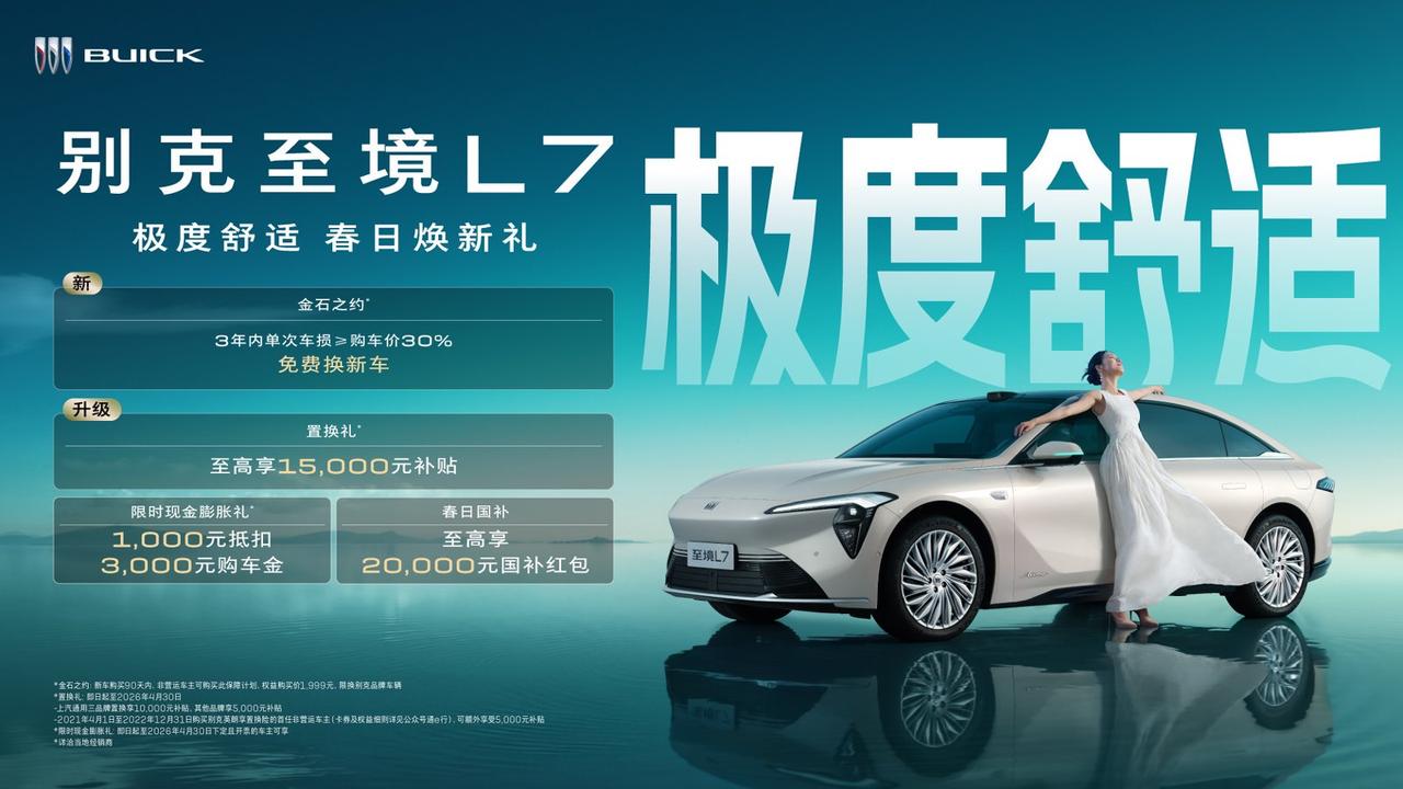 当别克至境L7迎来上市以来最大规模的功能升级,20万预算的购车清单上便多了一个无法绕开的选项。全新“晨晖米”车色为外观注入清新格调,而内在的变革更具分量:预瞄式悬浮底盘的毫秒级滤震让驾控质感跃升新境,至境OS系统凭借同级最强的AI语音交互重新定义人车默契,四座云感悬浮座椅通过劳斯莱斯同款悬浮层设计将舒适体验具象化。艾维亚车型升级预瞄式悬浮底盘,20余项核心进化共同编织出动态平顺、智能贴心与静谧松弛三位一体的感官盛宴。产品力全面跃升的背后,别克更以贯穿用户全生命周期的诚意打造价值护城河——新能源轿车领域首创的“金石之约”保障,为非营运车主提供3年内单次事故车损超购车价30%即免费置换新车的坚实守护,将意外风险消弭于无形。自即日起至2026年4月30日,至高15,000元置换补贴可叠加1,000元抵3,000元现金膨胀礼,更有至高20,000元“春日国补红包”加持。若想亲身感受这场从产品到保障的全面革新,不妨亲临当地别克授权经销商,解锁更多惊喜细节。