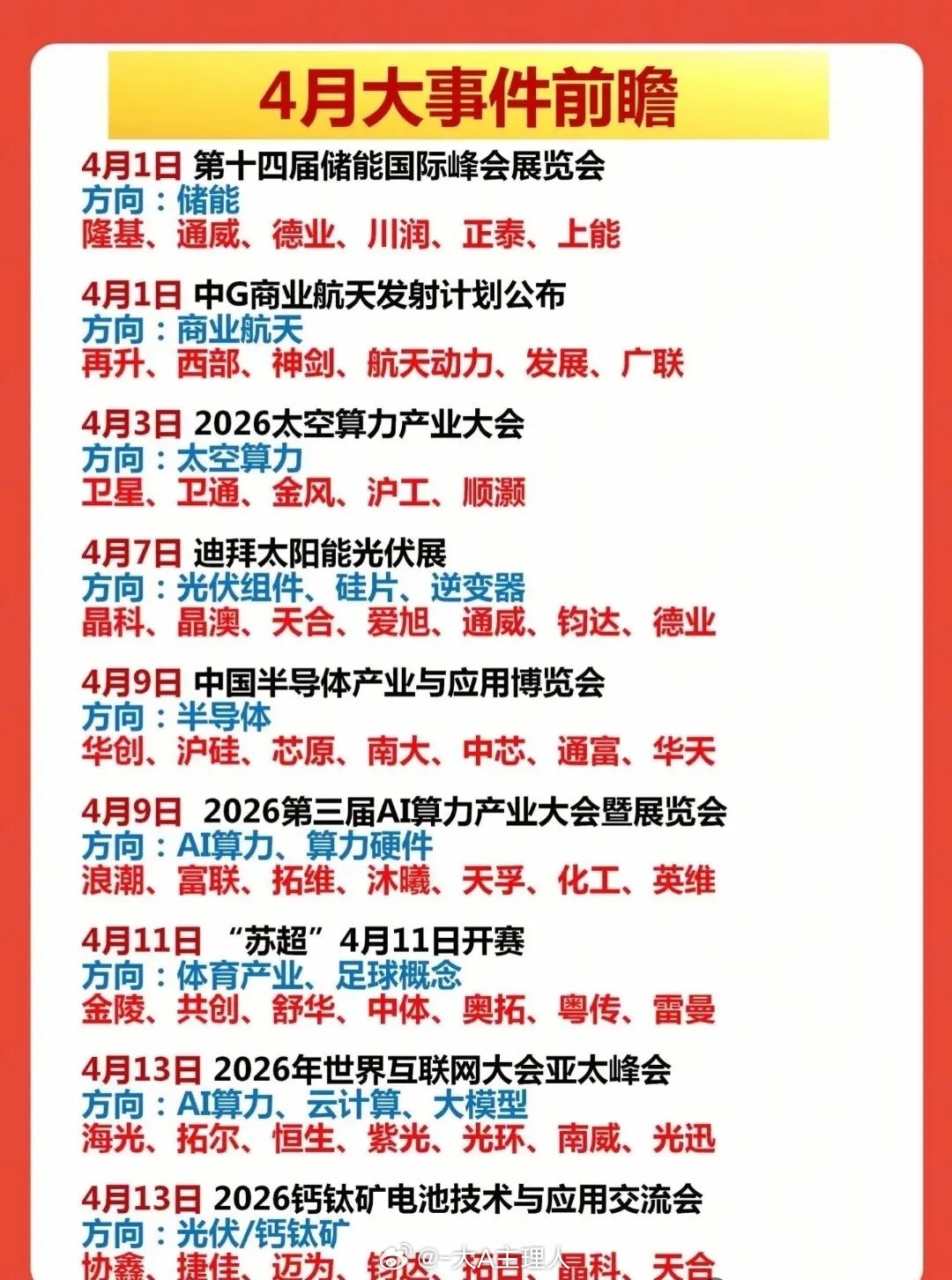 4月产业“超级风暴”来袭!20+场顶会刷屏,储能、商业航天、人形机器人全炸场,你准备好了吗?4月行情即将开启,一大波行业重磅会议密集来袭,豆包认为值得关注的四大主线:9日AI算力产业大会将引爆算力硬件、光通信等科技主线。17日人形机器人生态大会将加速机器人产业链商业化落地,20日 中国半导体设备与材料峰会,半导体两场博览会持续强化国产替代逻辑。23日全球无人机展则为低空经济赛道注入新动能,四大事件将成为4月把握科技成长行情的关键窗口。⚠️ 风险提示:以上内容仅为公开信息整理,不构成任何投资建议,股市有风险,投资需谨慎。