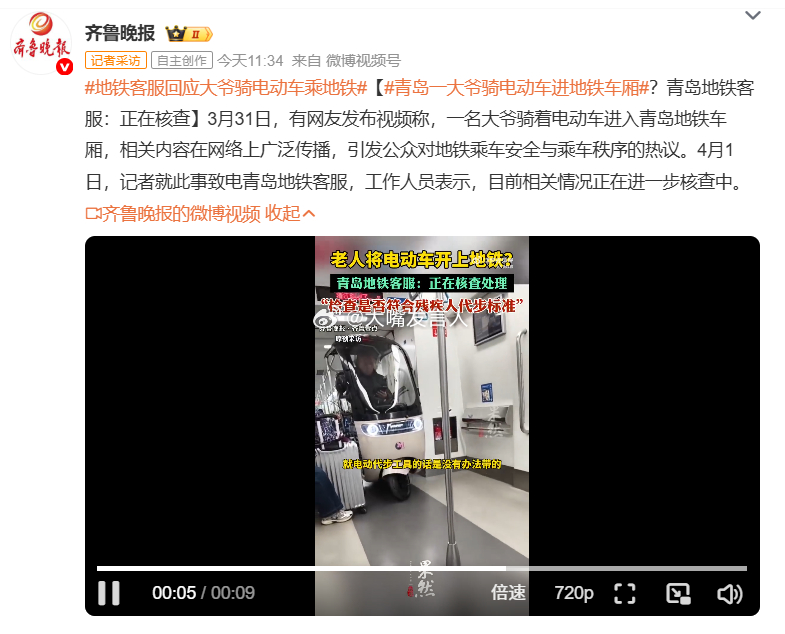青岛一大爷骑电动车进地铁车厢 看话题,起初我以为是折叠电动二轮车,点开新闻一看,原来是带棚的电三轮你大爷还是你大爷,他是怎么过的安检,怎么刷卡进的站,怎么下的台阶呢?地铁客服回应大爷骑电动车乘地铁,热点观点