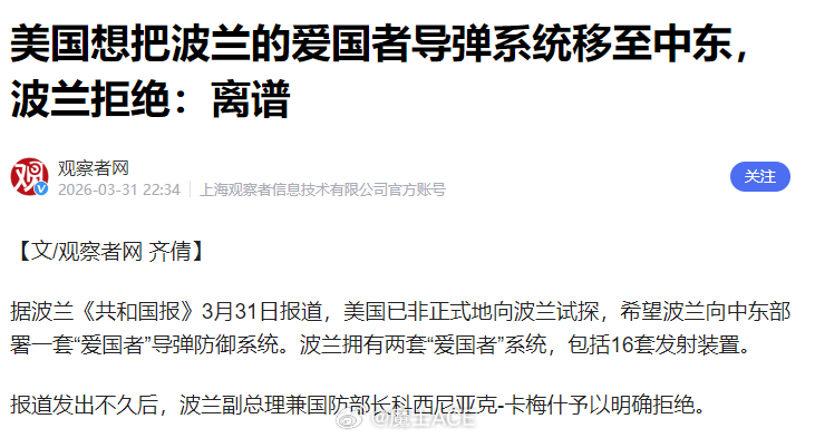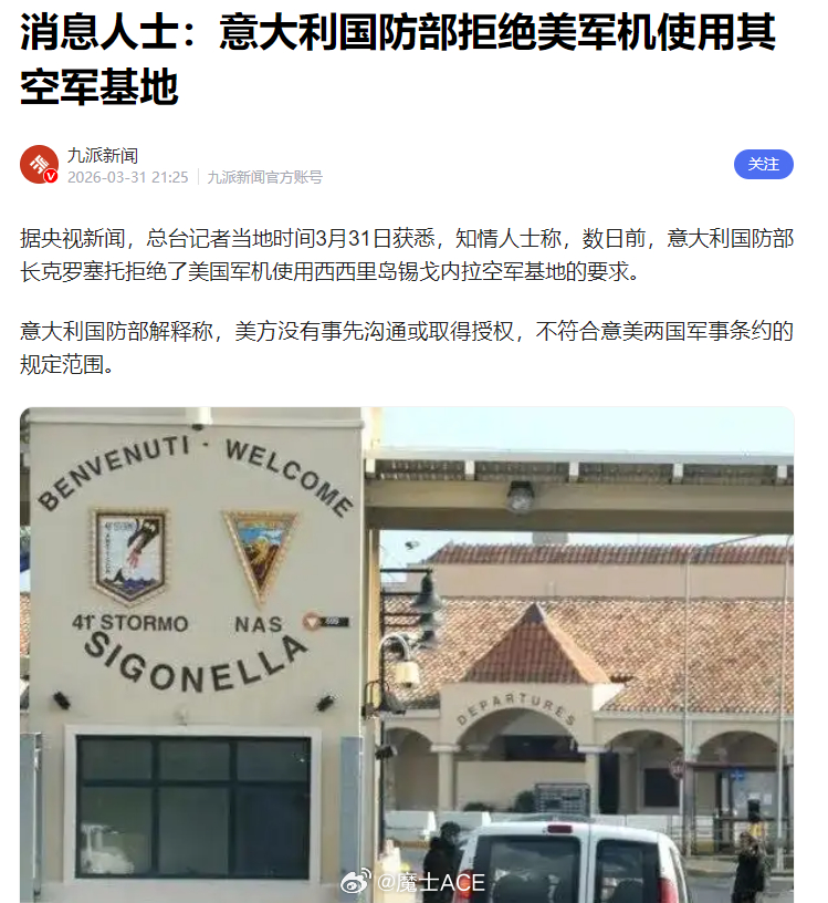 笑死,老美这次算是体验到了一把众叛亲离!昨天,老美的防长赫格赛斯,精锐的电台主持人,会主持节目的海军陆战队排长,宣布——老川子战后将决定北约的去留。老川子这次估计是气到了,从来没有被这样背刺过。诶,今天就遇到了。3月20日,北约驻扎在伊拉克的联军,在漫天导弹中统统溜号。3月24日,英不列颠儿宣布不允许美军使用英国基地打击伊朗能源设施。3月31日,法兰西拒绝军事火力投射任务的战机飞过法国领空。3月31日,意大利拒绝美军使用意大利的军事基地对伊朗发起打击。3月31日,波兰拒绝了老美寻求爱国者导弹援助的请求。如果说这是日记,堪称地缘史上最可怕的日记。回想一下,就在一个月以前,英法意德等八国欧洲军还要在格陵兰岛对抗美军呢?也别怪别人,老川子自己不当人在前面,现在知道自己突破底线之后的代价。盟友不是召之即来挥之即去的NPC,那都是要靠共同利益维持的。当老川子想抢格陵兰岛的时候,欧美就已经开始裂开,彻底分道扬镳只是时间问题。老川子这几天连连破防——直接喊欧洲想要石油要么找自己买要么自己去控制海峡!墙倒众人推,破鼓万人捶。把自己从联盟盟主打成孤家寡人,它水平也是真可以。想当年,美军在中东的哪次行动不是天下赢粮而影从?每次在中东的战争都是带着一票小弟冲锋。现在被老川子玩成了独行侠,地缘手段是菜的抠脚!这次赫格赛斯放话,就是在催欧洲国家最后一次。欧洲国家一缩,没有一丝利用价值的欧洲,估计老川子停战后就会着手退出北约了。退出北约不说,老川子2026年下半年的目标,一个是古巴,一个估计就是格陵兰!烽火问鼎计划以色列总理称伊朗已不构成生存威胁美伊以冲突