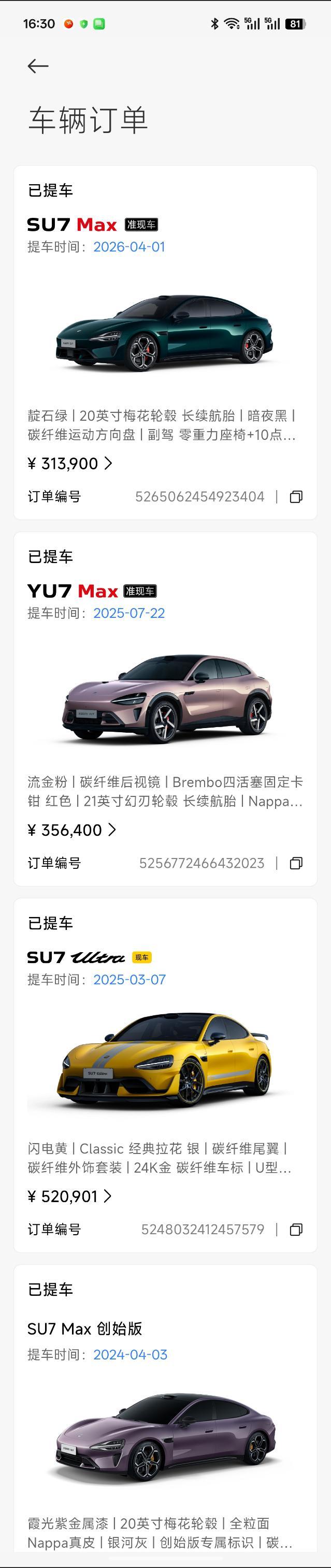 雷总,这是我们家的第四台小米了,今天喜提新一代小米SU7Max靛石绿,能祝福一下我们家吗?四台小米提车时间:第一代小米SU7Max创始版:2024.4.3小米SU7Ultra:2025.3.7小米YU7Max:2025.7.22新一代小米SU7Max:2026.4.1