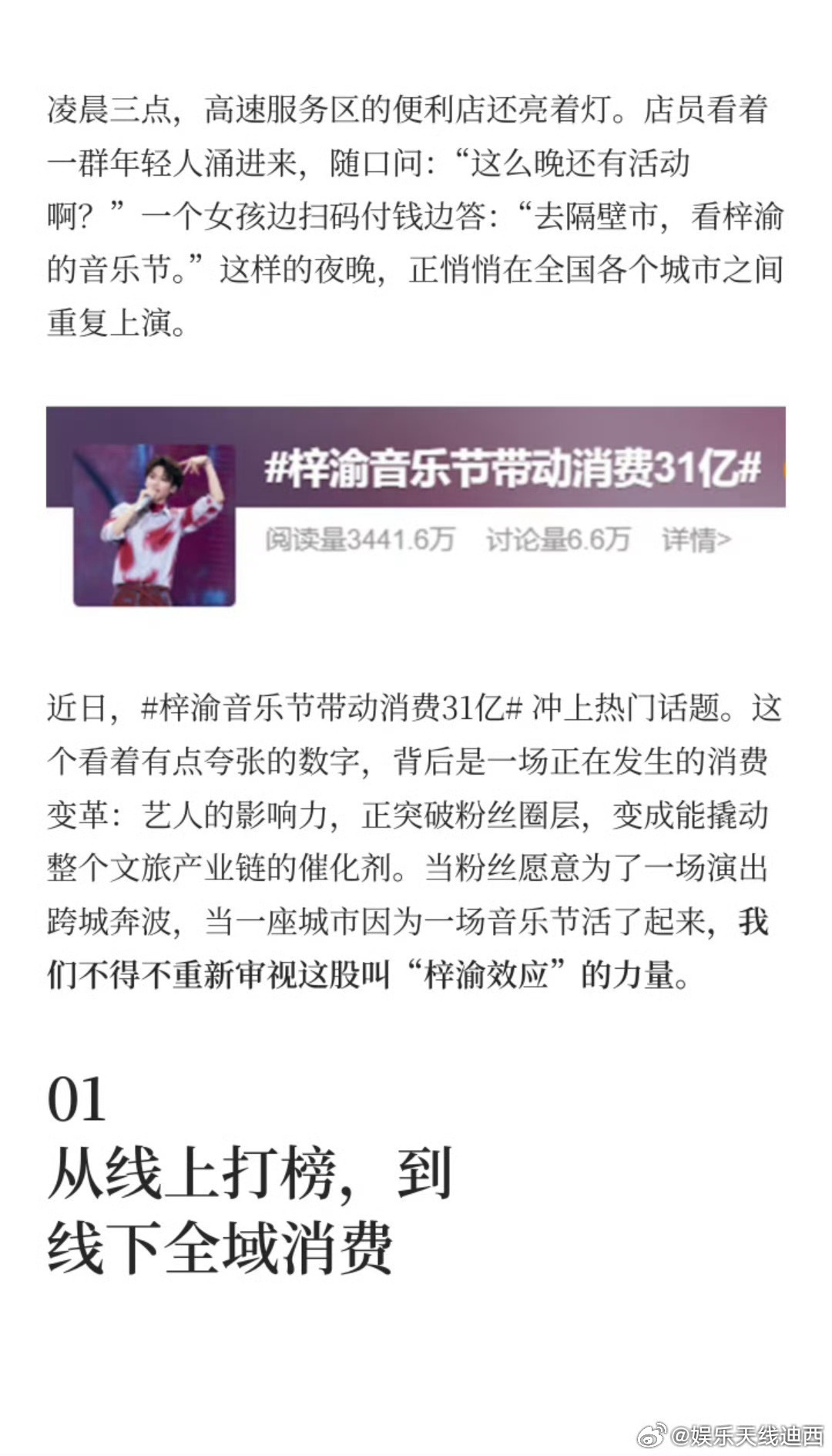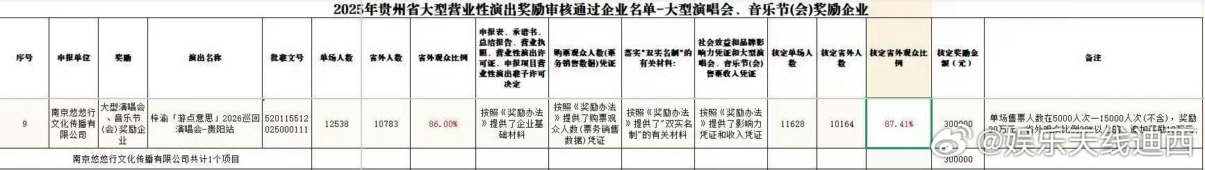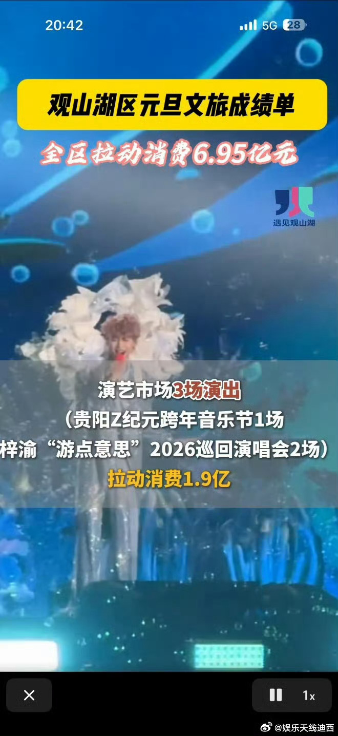 梓渝贵阳演唱会跨城粉丝达86%⭐贵阳举行的2026年演艺经济发展洽谈会上,又提到梓渝贵阳演唱会成绩!贵阳场演出核定单场人数为11628,其中省外占比86%,获得了2025年贵州大型营业性演出奖励30万。✅贵阳跨年演唱会拉动消费超亿元;✅梓渝演出顺应文旅部号召推动的“文旅带动经济” “为演出买单”“跟着非遗去旅行”的文旅经济发展;✅44天4城10场动员12万粉丝;✅粉丝自发“跟着梓渝游华夏”等活动,联动文旅放大正向影响力;✅巡回演唱会共计带动文旅消费累计8.35亿+,单场拉动区域消费1.9亿。