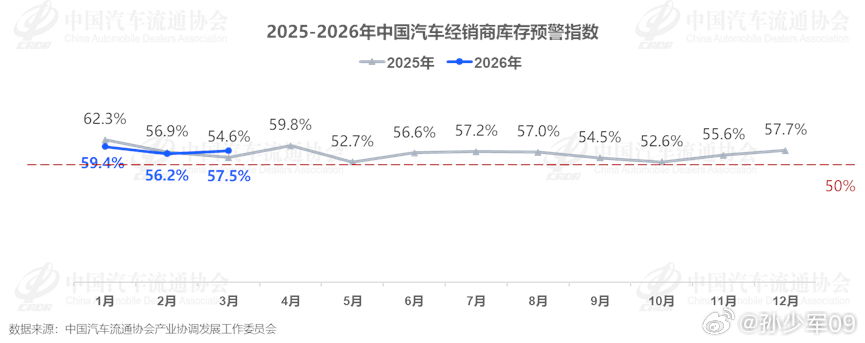 2026年3月中国汽车经销商库存预警指数为57.5%,同比上升2.9个百分点,环比上升1.3个百分点,库存预警指数位于荣枯线之上。