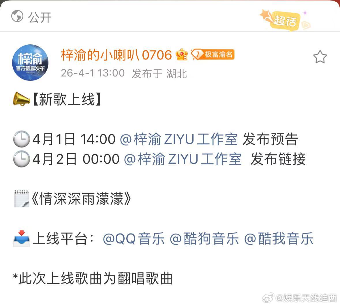 梓渝情深深雨濛濛上线 梓渝小喇叭发新歌通知🔮哈哈!愚人节混进来一个真的,📣梓渝今晚零点发歌啦!朋朋妈的老式小孩又来给yuni唱歌了!情深深yu濛濛世界只在ni眼中,孩子是知道朋朋妈想听什么的