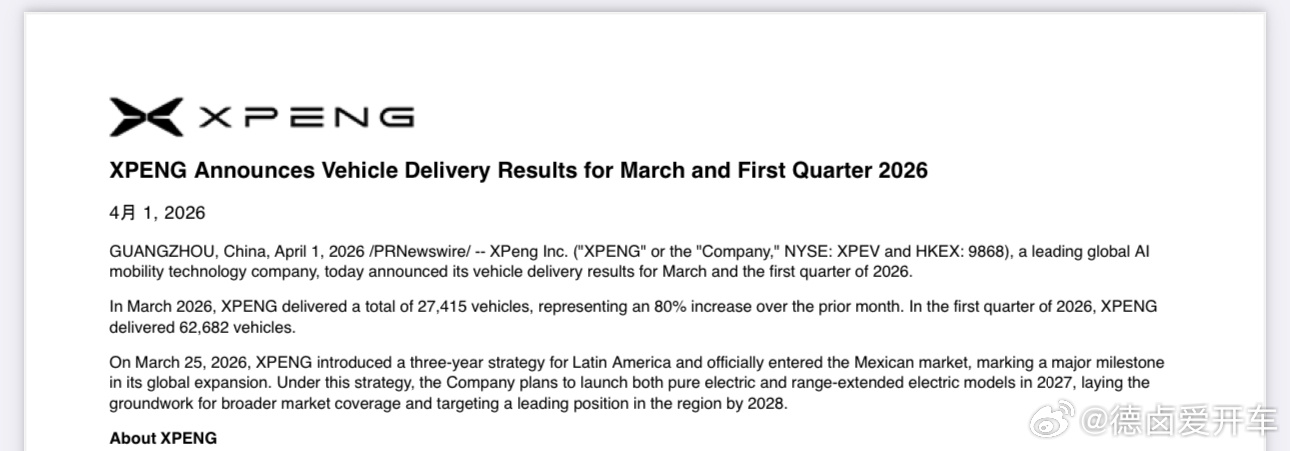 3 月份小鹏交付 27415 辆,一季度共计交付 62682 辆,达成6.1万-6.6万交付指引,上周宣布开启拉美三年战略,并同步正式进入墨西哥市场。小鹏汽车新能源汽车