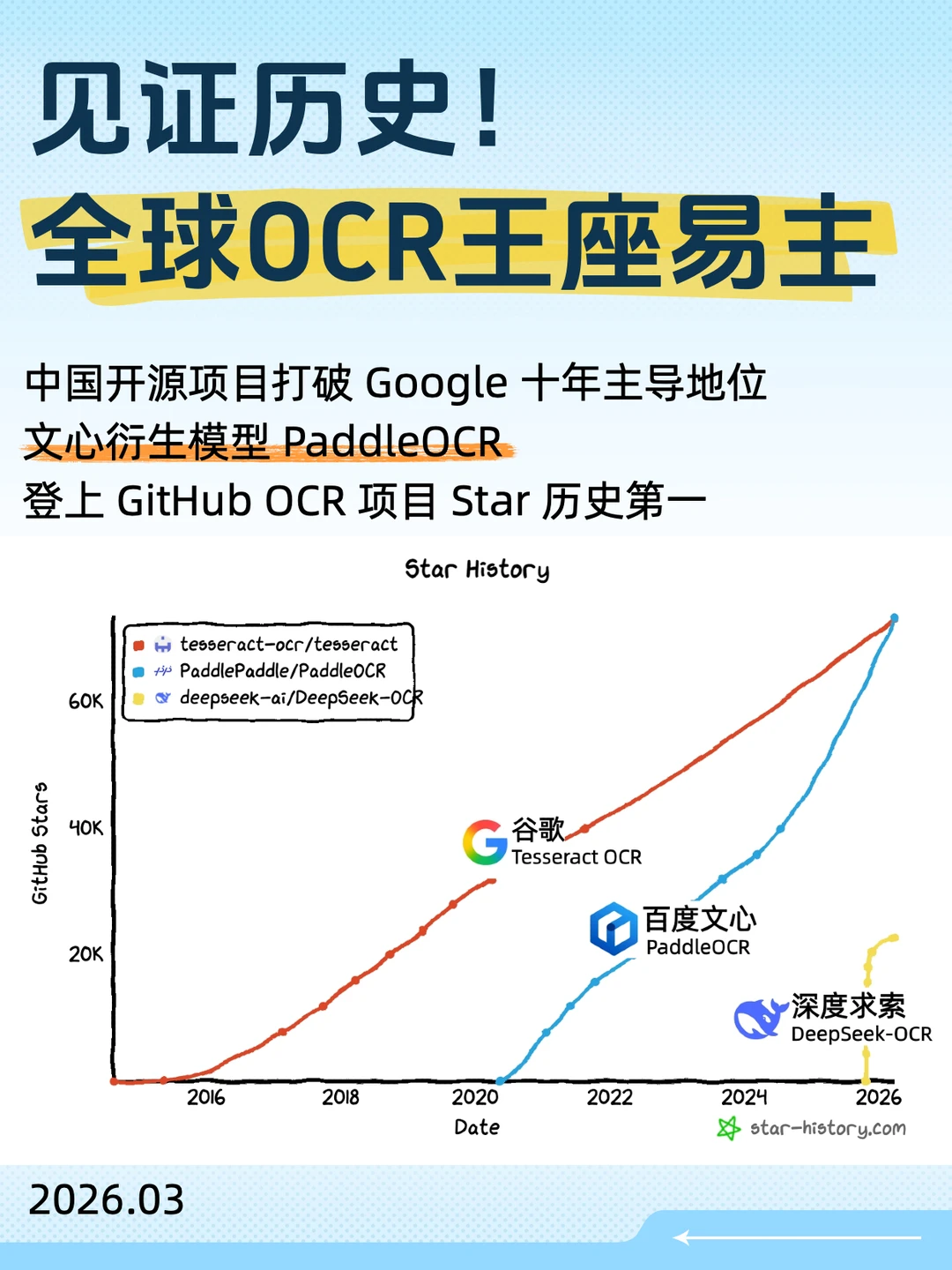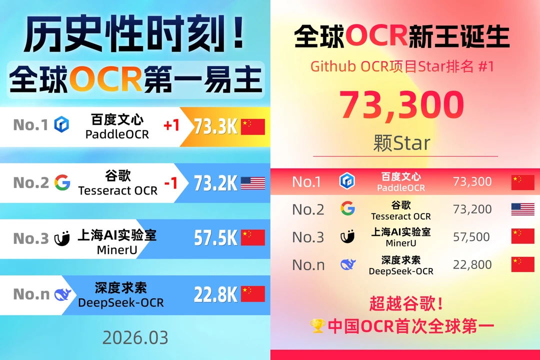 百度文心衍生模型PaddleOCR的Star数(73.3k)稳稳超过谷歌Tesseract OCR(73.2k),正式登顶全球第一。📈
