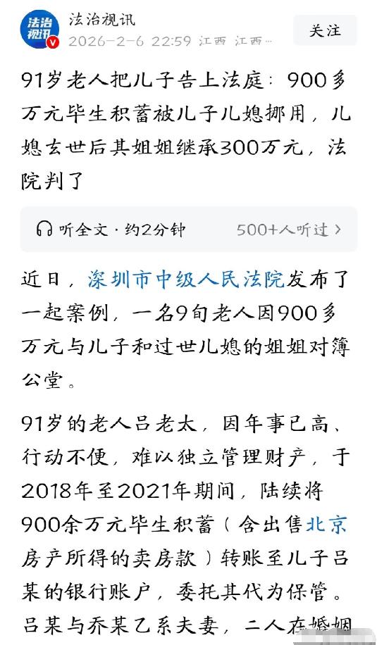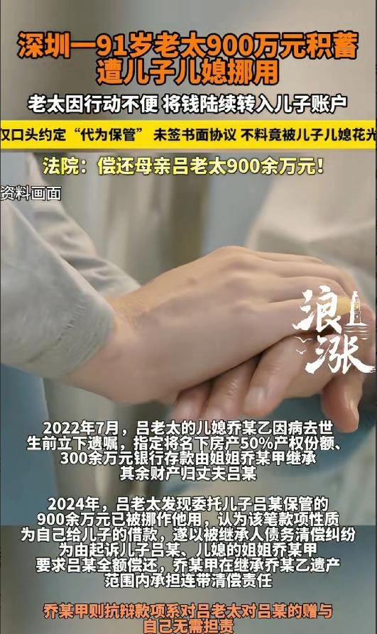 这就是养儿防老?广东深圳,91岁老太年龄大了,怕自己突然老糊涂,就将900多万积蓄全部转给儿子,由儿子代为保管。本想着儿子是最靠得住的,谁知,儿子儿媳竟瞒着她,用这笔钱还了自家房贷,装修了房子。更可气的是,儿媳突然去世,还立下遗嘱,将其中的300万给了自己的姐姐。得知真相后,老太婆暴怒,她没想到儿子如此自私糊涂,一纸诉状将儿子和儿媳的姐姐告上法庭,要求全额还钱。 咱先说说这事儿的背景,91岁的吕老太,一辈子勤勤恳恳,省吃俭用,好不容易攒下了900多万的积蓄,这里面还包括她卖掉一套北京房产的钱,那可是她后半辈子的养老底气啊。 俗话说“养儿防老,积谷防饥”,人老了,最盼着的就是儿女能靠得住,尤其是自己行动不便、脑子也不如以前灵光的时候,能有个贴心人替自己操心。 吕老太年纪越来越大,手脚不利索,自己管这么多钱也力不从心,就怕哪天突然老糊涂,钱都不知道怎么花、怎么管。 思来想去,她觉得最靠谱的还是自己的亲儿子,毕竟是从自己身上掉下来的肉,总不能亏着自己吧?可谁能想到,这份掏心掏肺的信任,最后竟成了刺向自己的刀,这样的“养儿防老”,真的能靠得住吗? 从2018年到2021年,吕老太一笔一笔地把这900多万转到了儿子吕某的账户里,反复叮嘱他只是代为保管,等自己以后生病、需要用钱的时候,再拿出来。 儿子当时拍着胸脯保证,说一定会好好保管,绝不会动一分一毫,让老太太放一百个心,可他转身就把这话抛到了脑后,和儿媳乔某一起,瞒着老太太动了这笔养老钱。 两口子觉得,反正这钱暂时不用,不如先拿来还自家房贷、装修房子,就连日常开销也从里面出,还自我安慰说,这钱以后早晚都是他们的,一家人不用分得太清楚,老太太也不会计较。 天有不测风云,2022年7月,儿媳乔某突然因病去世,更让人气愤的是,她生前还立下遗嘱,把用老太太钱换来的300多万存款,留给了自己的姐姐乔某甲。 直到2024年,吕老太身体越来越差,经常住院花钱,想找儿子要回自己的钱,才发现儿子总是支支吾吾,追问之下才知道,自己一辈子的积蓄,早就被他们挪用得所剩无几,甚至还有300万被儿媳给了外人。 老太太又气又急,当场就炸了,一咬牙就把儿子和儿媳的姐姐告上了法庭。 法庭上,双方各执一词,乔某甲还辩解,说这钱是吕老太赠与儿子的,自己不用担责任。 可法院经过调查审理,最终给出了公正的判决:这900多万既不是借款,也不是赠与,而是吕老太委托儿子保管的,双方的保管合同成立。 儿子擅自挪用保管的钱,违反了义务,必须全额返还900多万;这笔钱用于小两口共同生活,属于夫妻共同债务,儿媳去世后,她的姐姐乔某甲继承了她的遗产,就得在继承的范围内,承担相应的清偿责任。 也就是说,儿子必须还老太太全部的钱,乔某甲也得在自己继承的遗产里,帮着还一部分。 这件事看下来,真的让人心里五味杂陈,吕老太掏心掏肺,把一辈子的积蓄都交给了儿子,图的不是回报,只是一份养老的安心,可换来的却是背叛和算计。 都说养儿防老,可有时候,最亲的人反而最伤人心。亲情就像一张薄纸,一旦被贪婪和自私戳破,就再也回不到从前。 儿子儿媳的做法,不仅寒了老太太的心,也丢了做人的良心,忘了是谁含辛茹苦把他养大,忘了老太太把钱交给她的那份信任。 其实,养老从来不是靠一句“养儿防老”的空话,而是靠儿女的孝心和担当,靠彼此的信任和珍惜。 金钱有价,亲情无价,别让贪婪毁了最珍贵的亲情,也别让“养儿防老”,最终变成一场令人心寒的笑话。 大家对此怎么看?欢迎评论区留下您的观点!